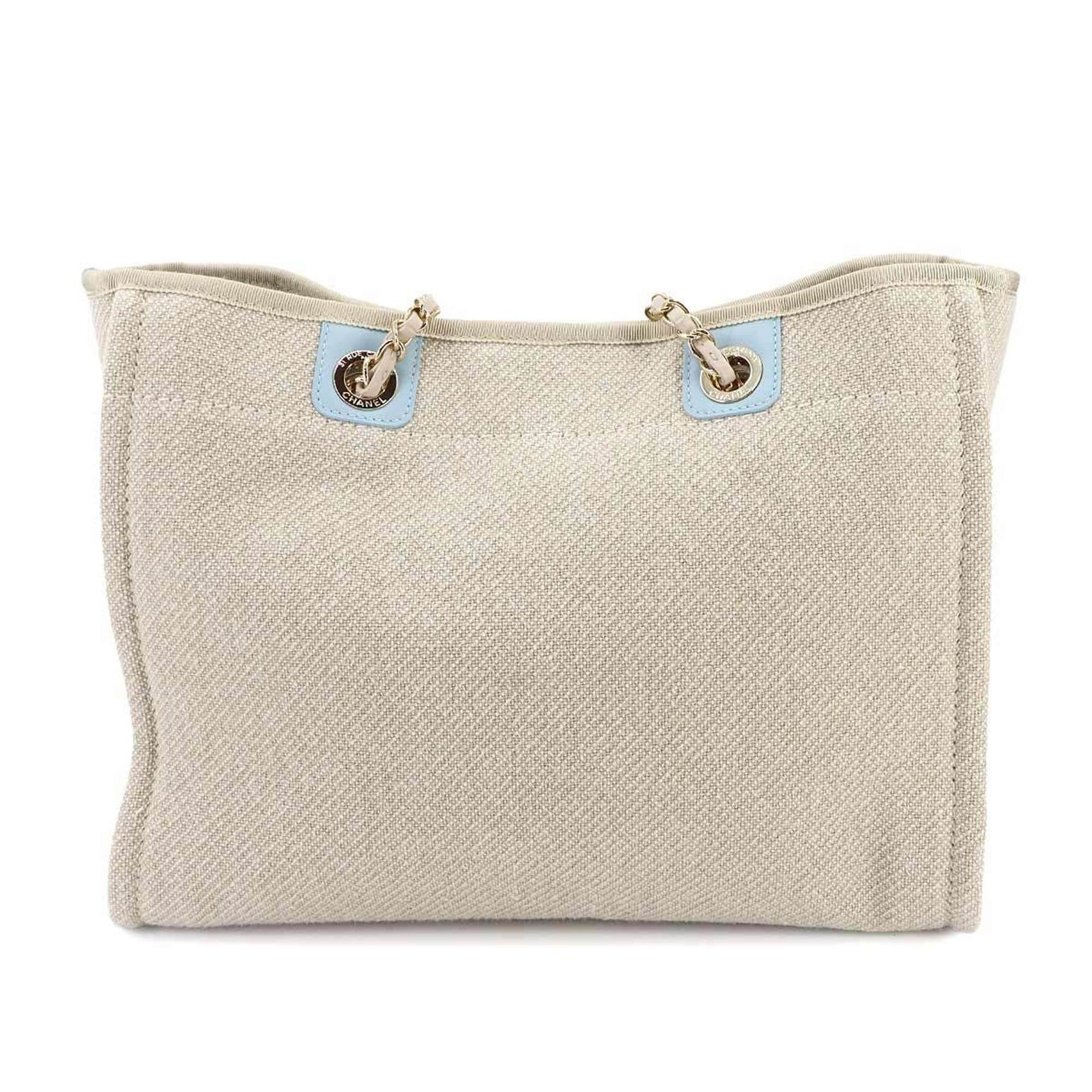 CHANEL Deauville MM Chain Tote Bag, Beige Blue Canvas with Gold Hardware, A67001
