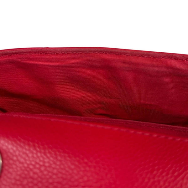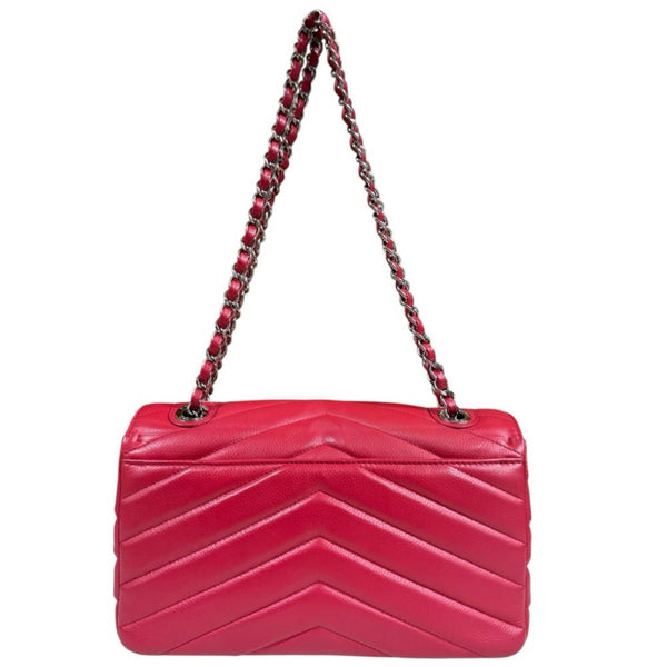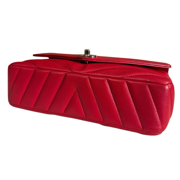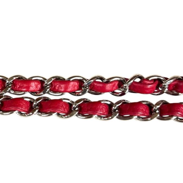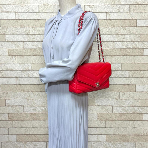 Chanel V-stitch shoulder bag in red leather with a double chain.