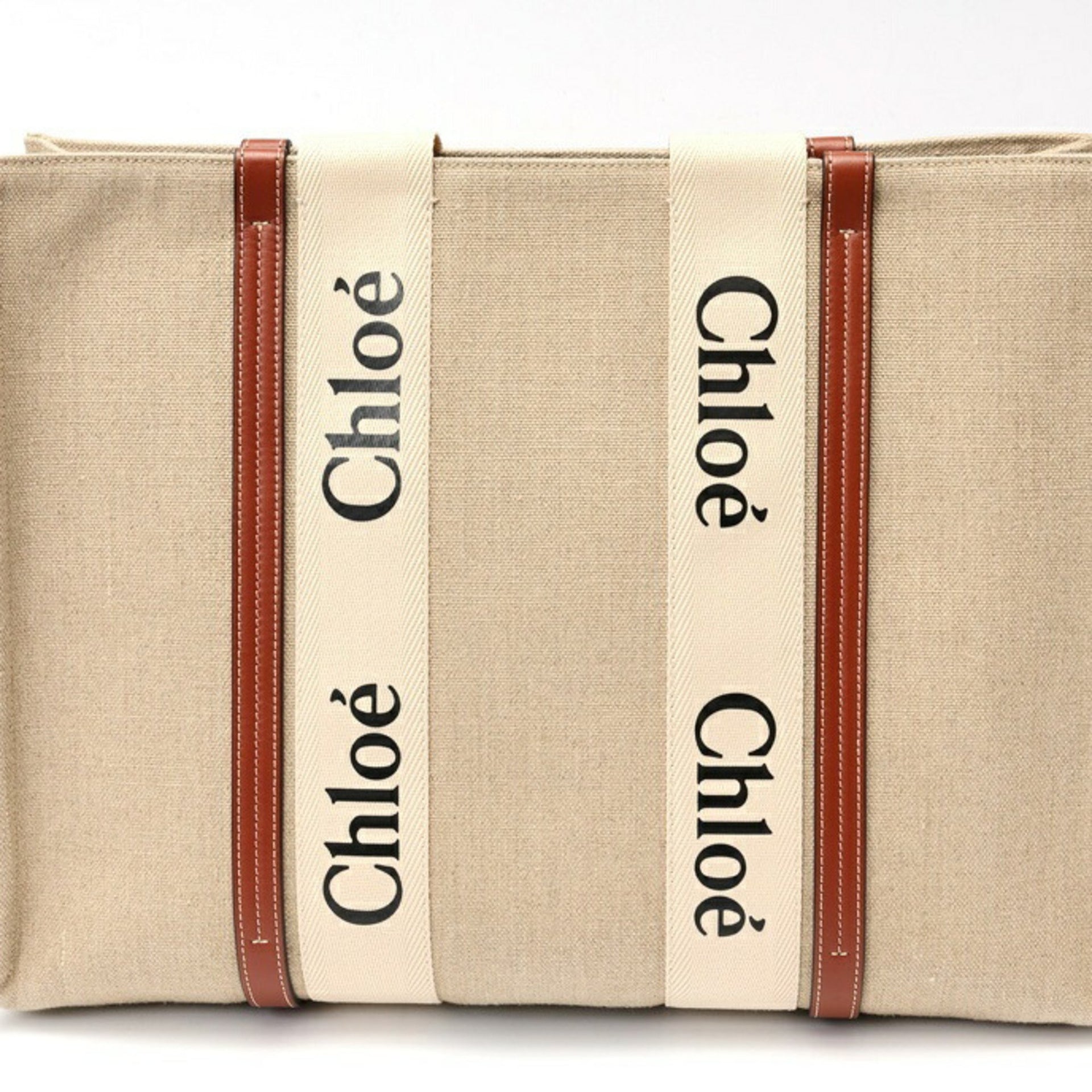 Chloé Chloe Woody Large Tote Bag Linen Canvas White Brown S-159330