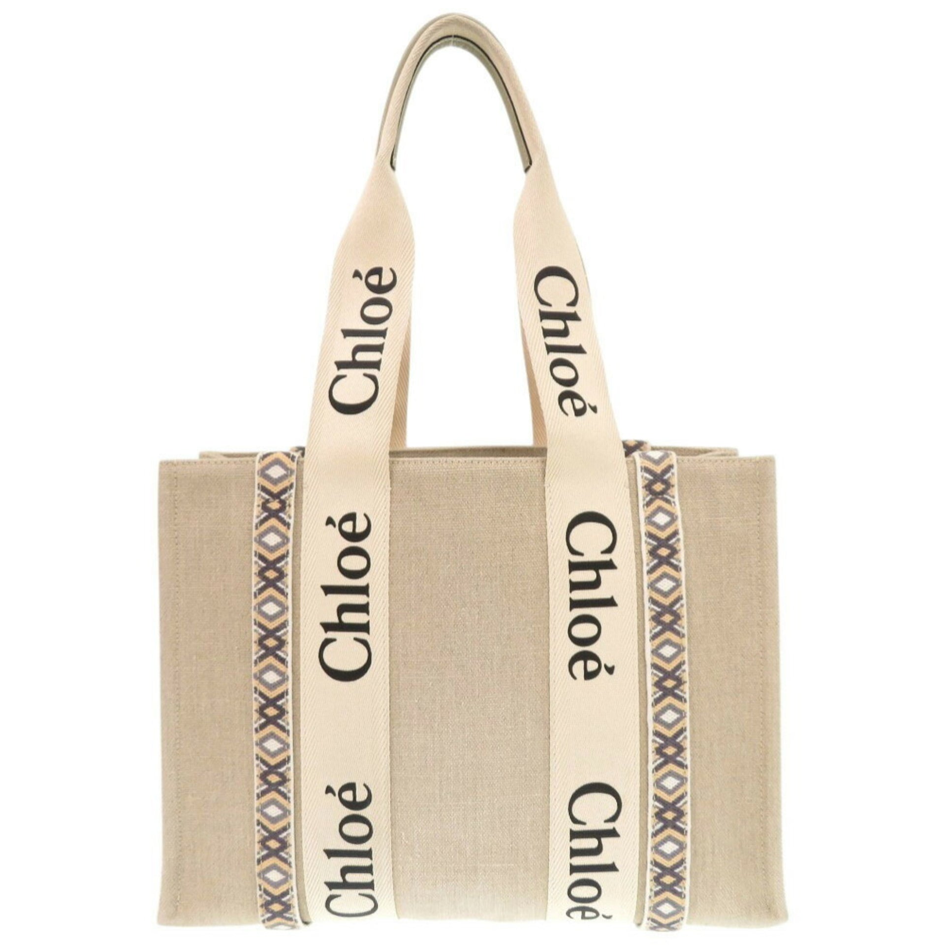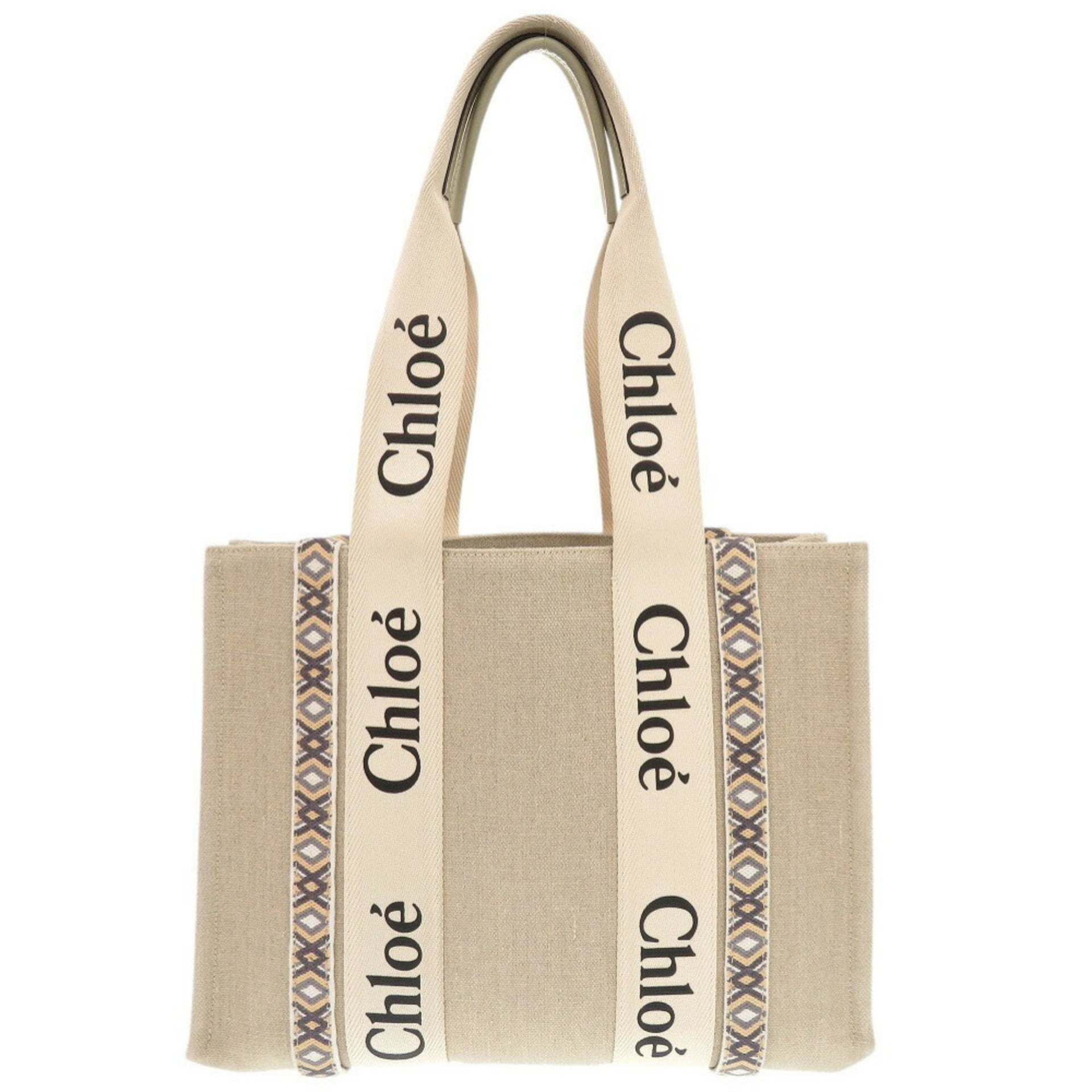 Chloé Chloe WOODY Medium Leather Linen Canvas Beige Tote Bag Shoulder 0459Chloe