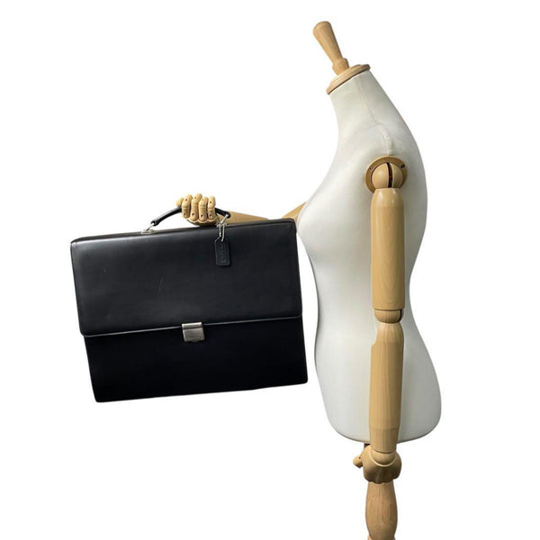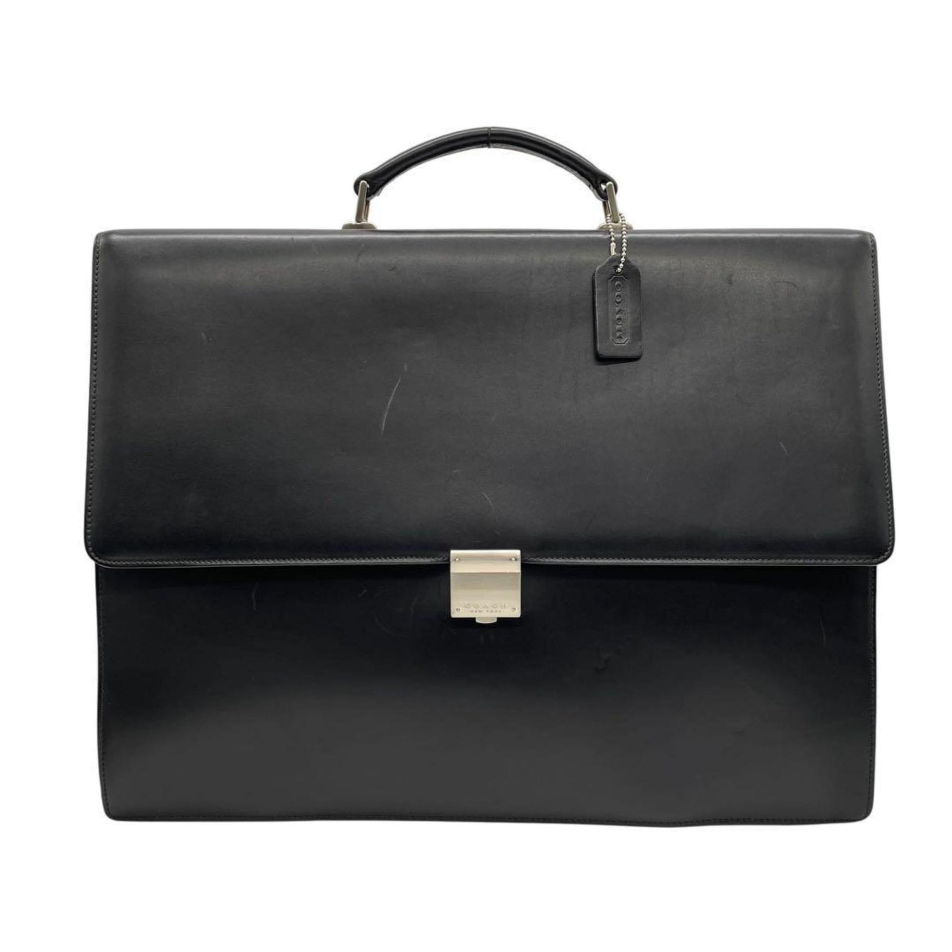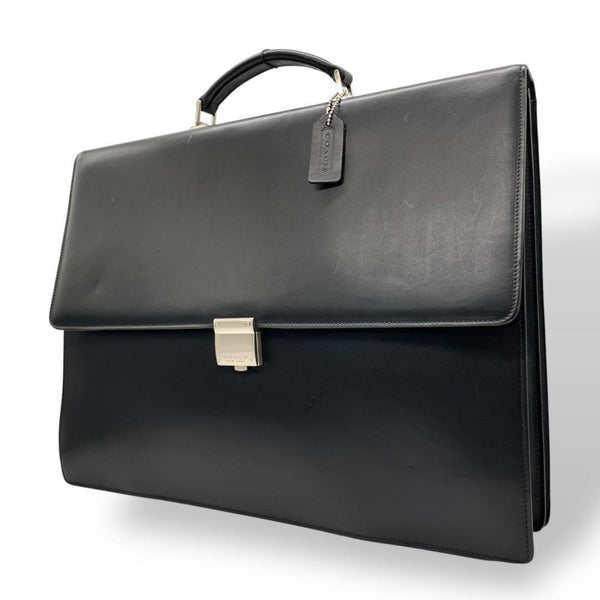 Coach business bag, black leather, A4 size, briefcase, flap, handbag, tote silver hardware, charm included.