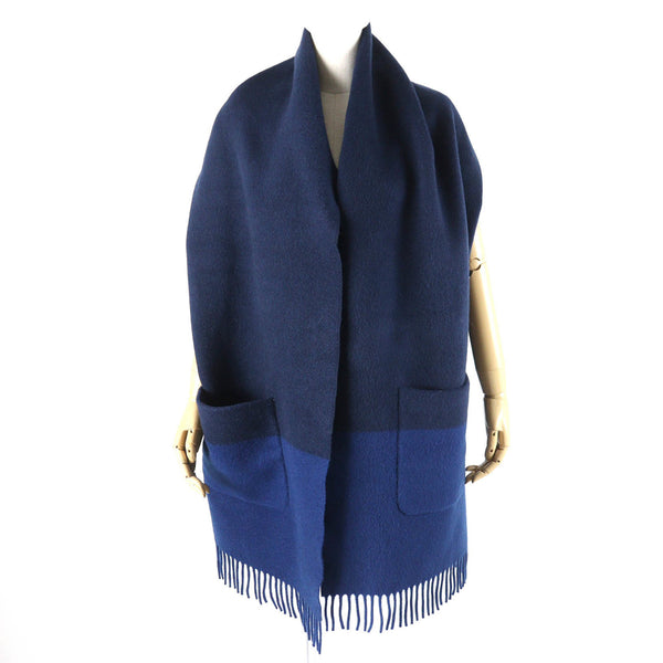 HERMES H259096S Allumette Pocket 100% Cashmere Marine Cobalt Leather Tag Fringe Large Shawl Scarf Two-Tone Made in Italy Women\'s