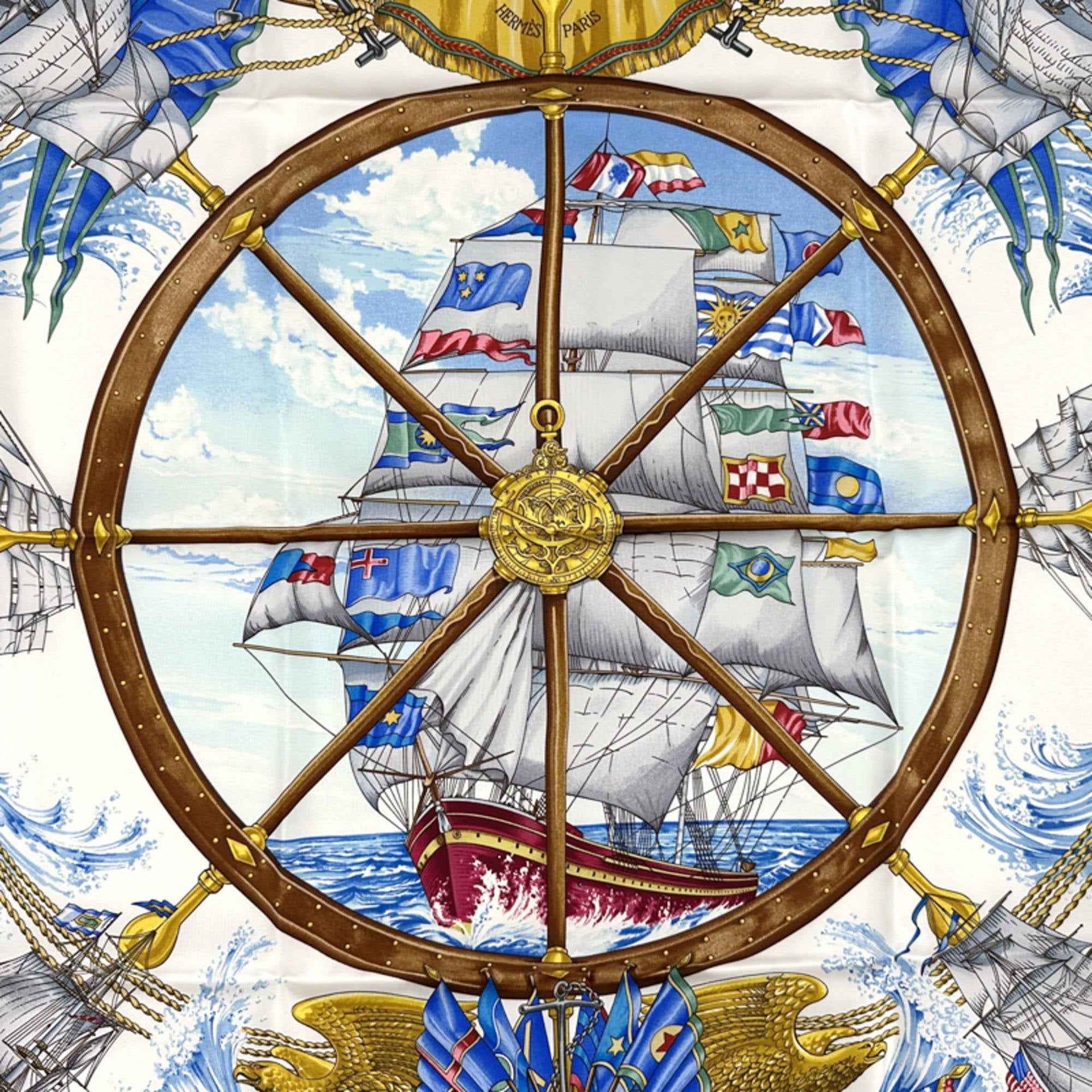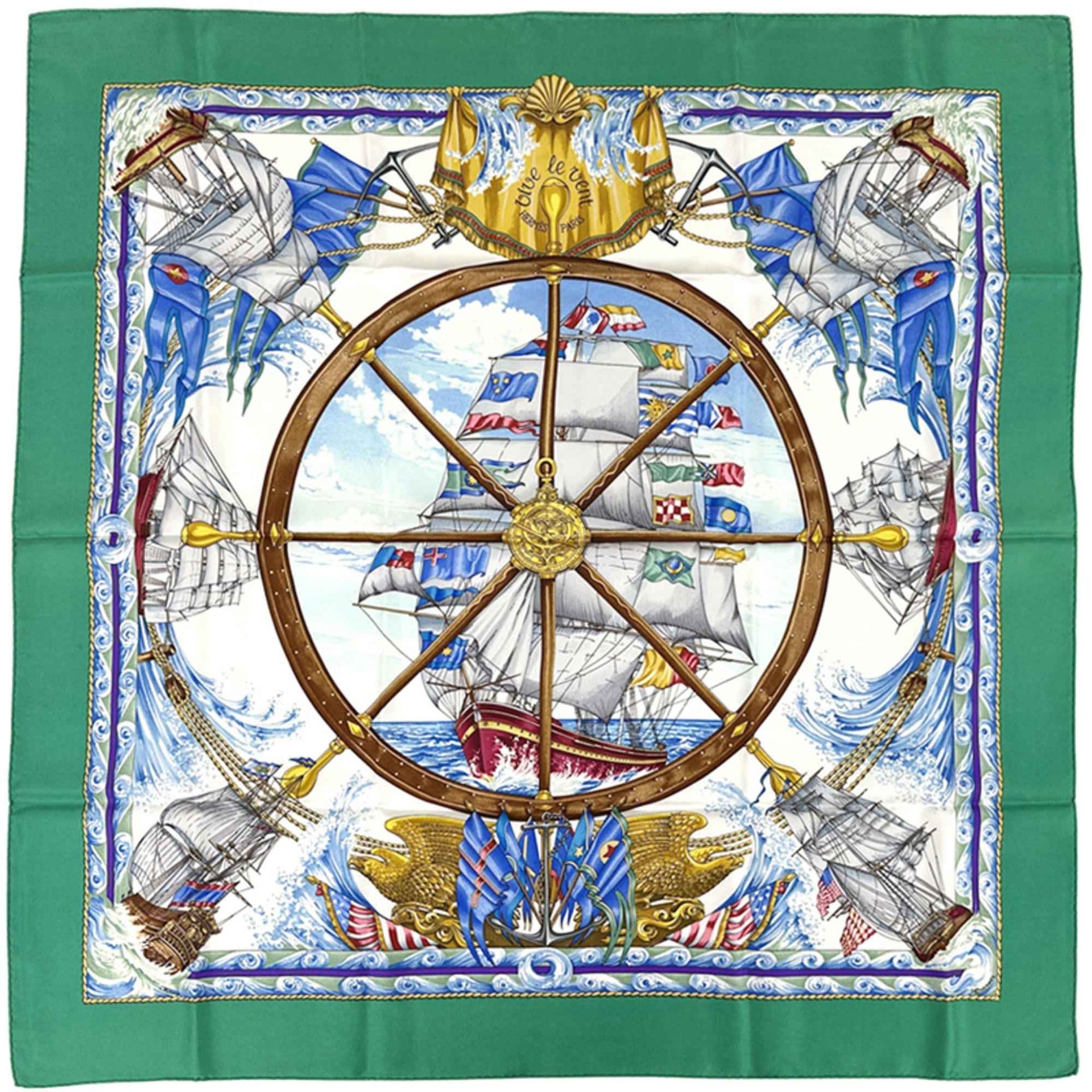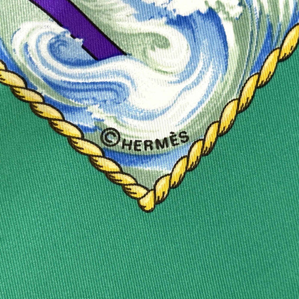 Hermes Hermès Carré 90 Scarf \"Vive le vent\" (Wind Blow) Women\'s Silk Green Multicolored Sea Ship Sailing