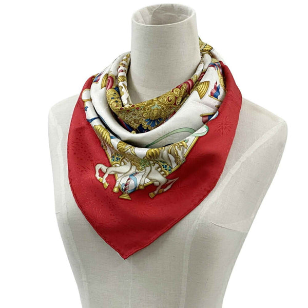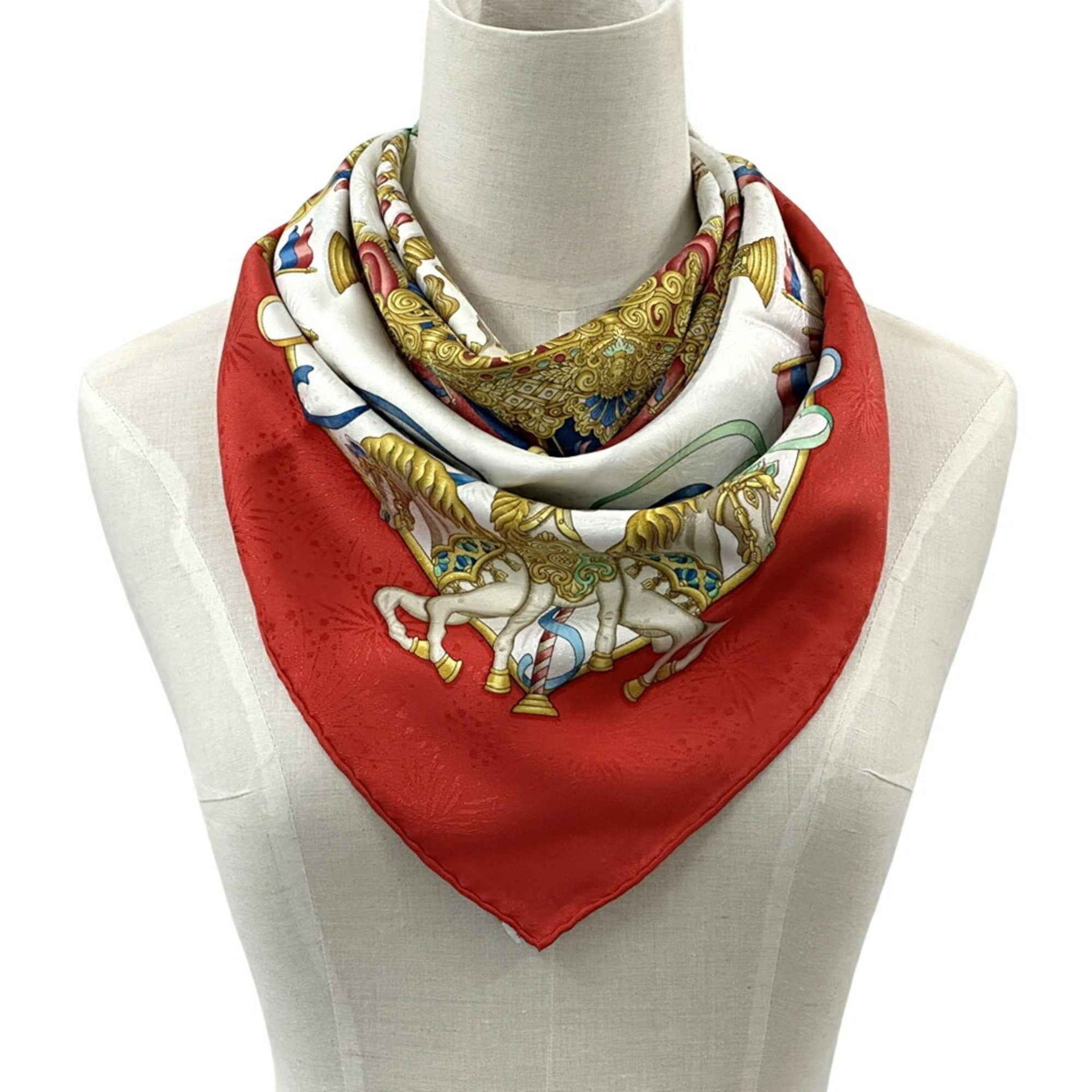 Hermes Hermès LUNA PARK Carré 90 Scarf, Women\'s Silk, Red Multicolor, Merry-go-round Horse Design