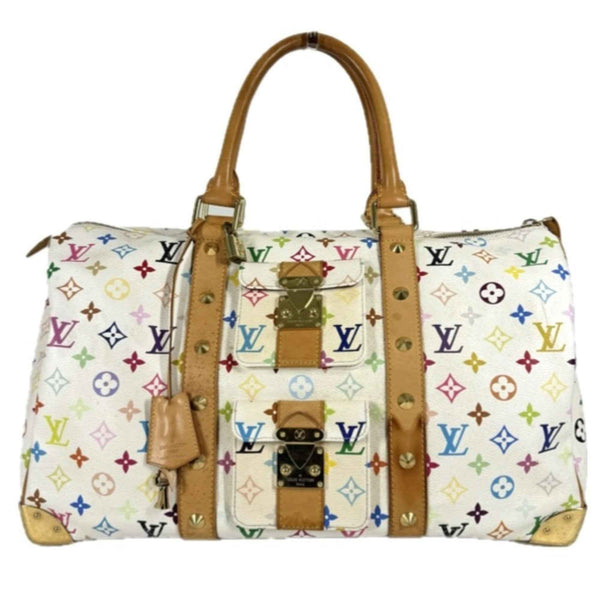 LOUIS VUITTON M92641 Monogram Multicolore Keepall 45 by Takashi Murakami. This handbag/travel bag/Boston bag is crafted from canvas and available in blanc white. Available for men women.