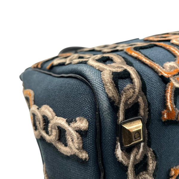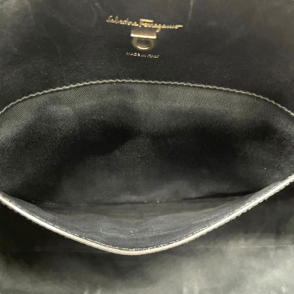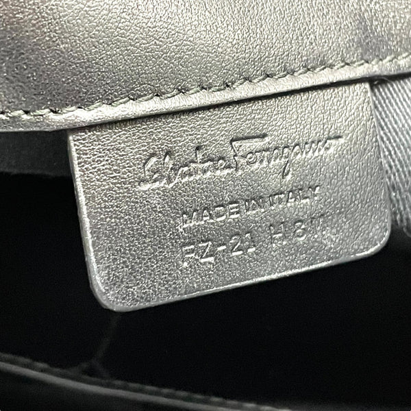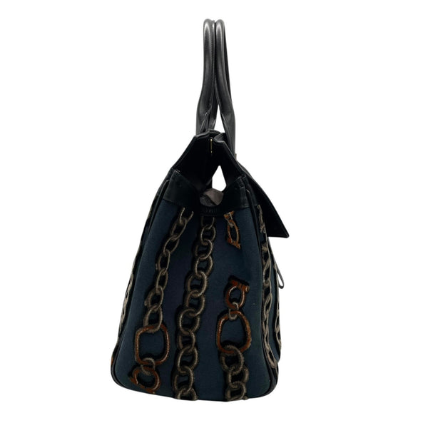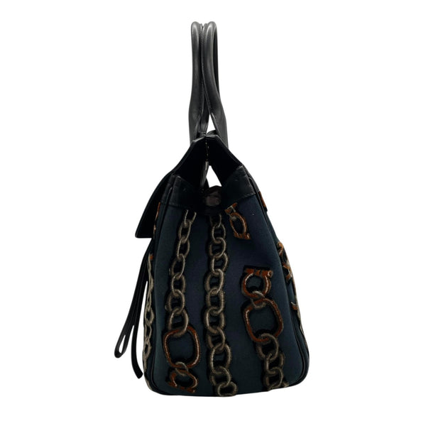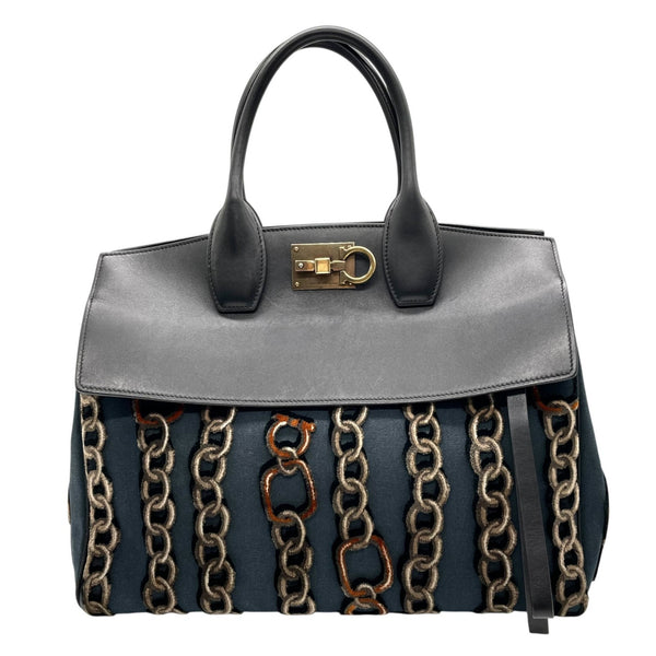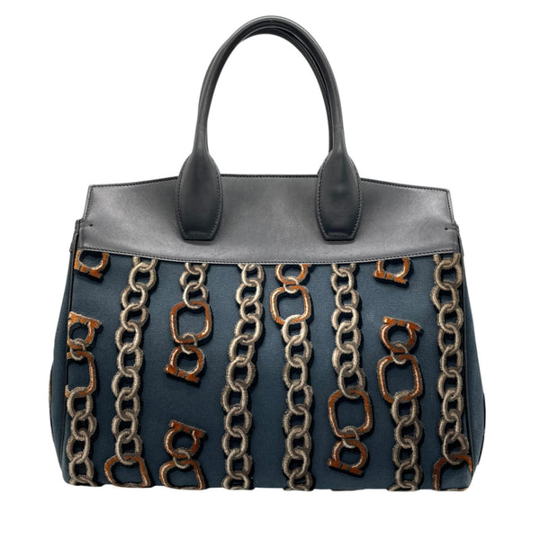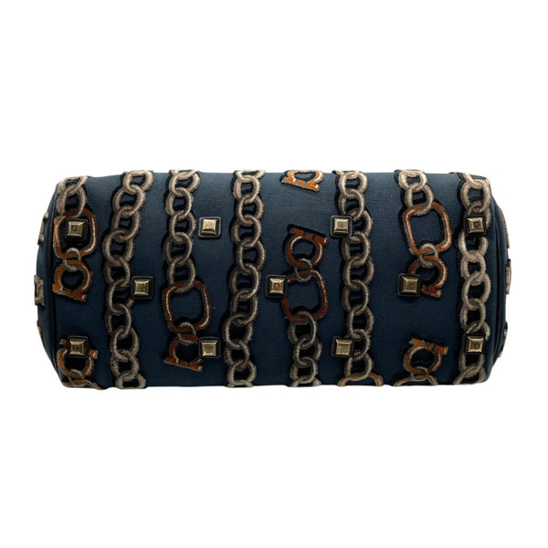 Salvatore Ferragamo Gancini chain-patterned handbag in navy or black canvas and leather with gold hardware. Women\'s size B.