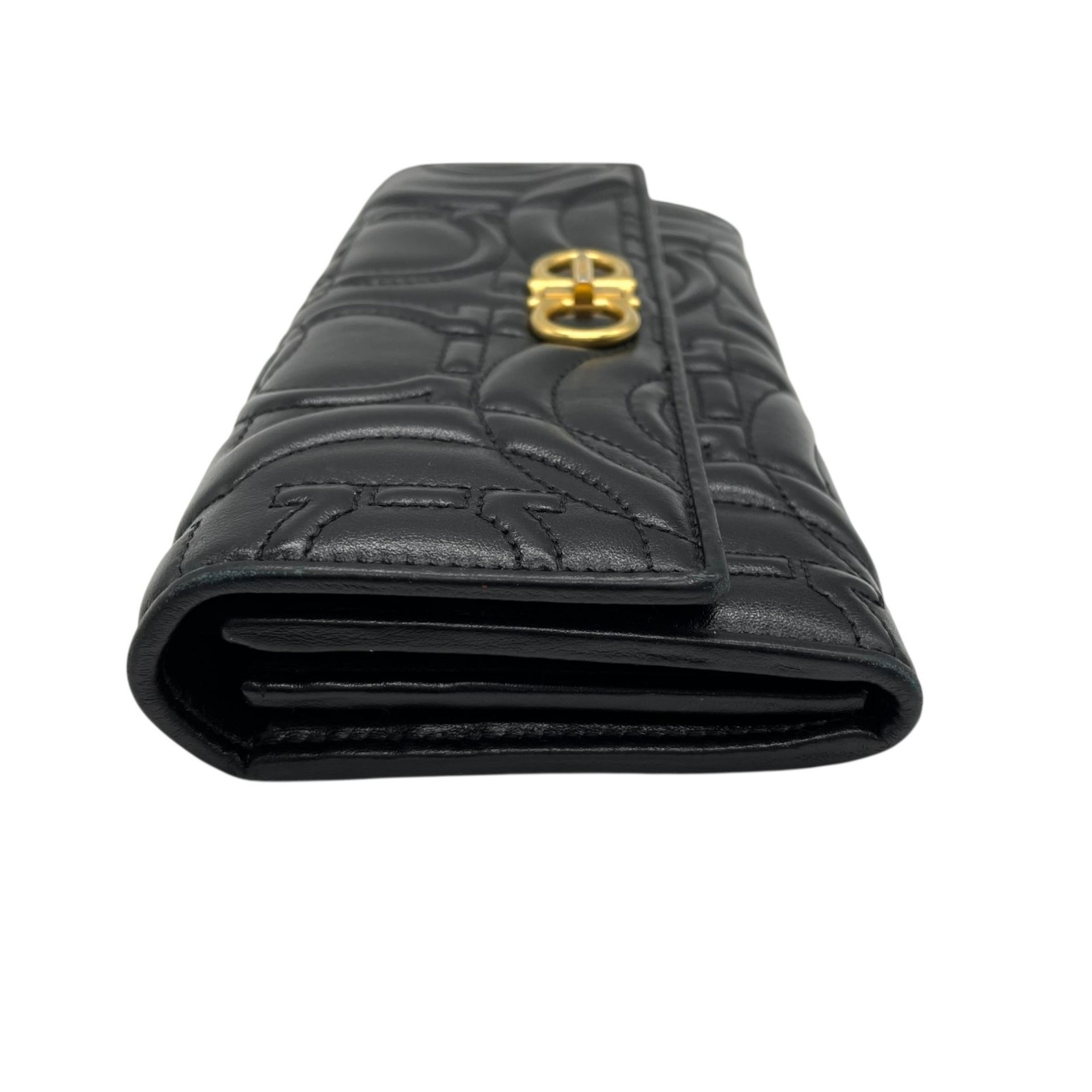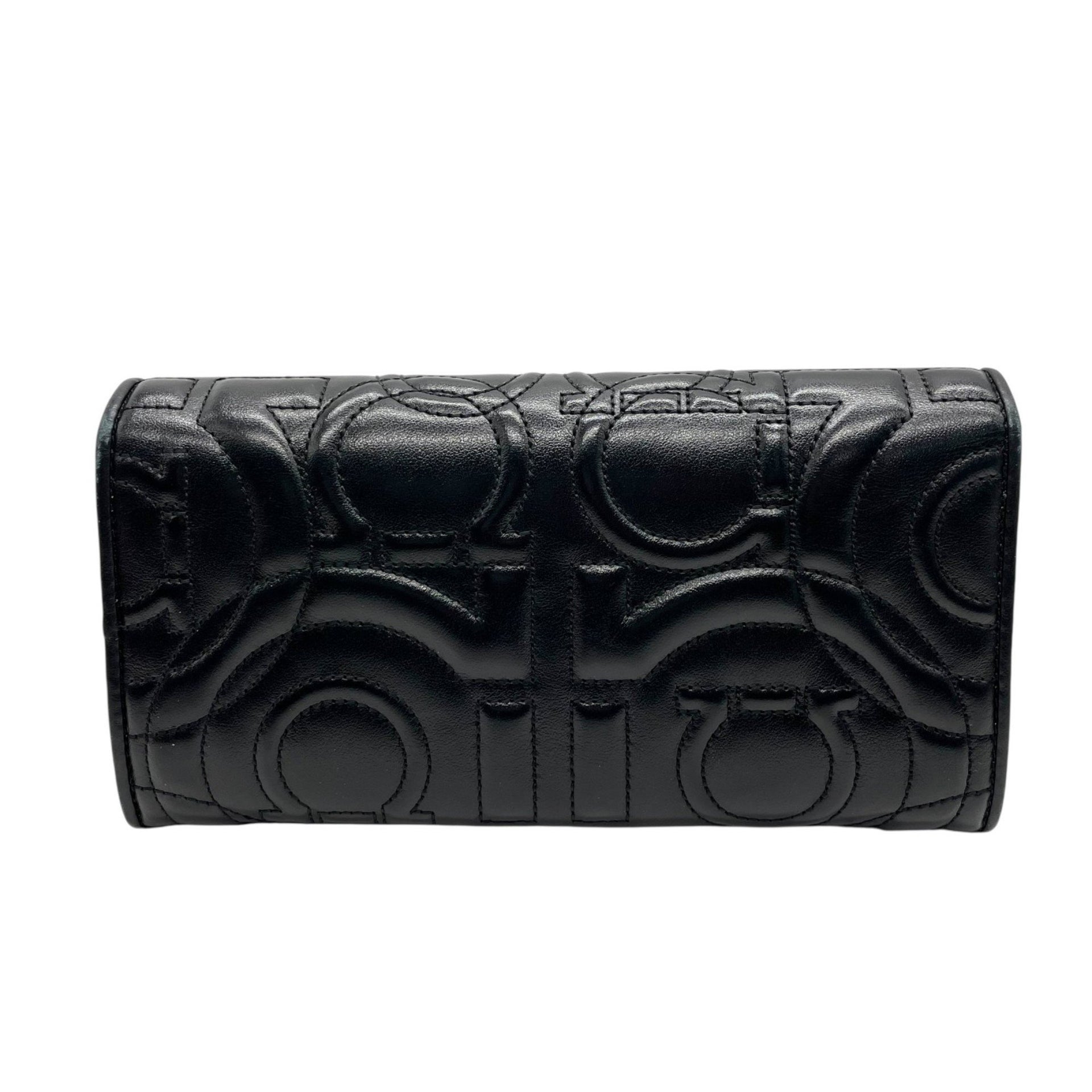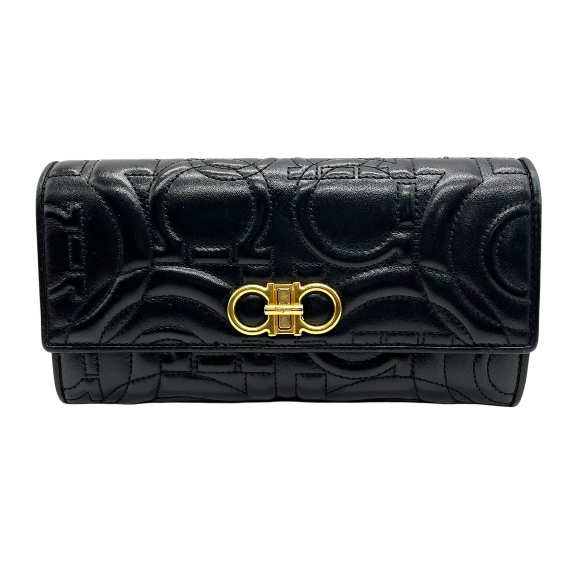 Salvatore Ferragamo Gancini Double Embossed Turnlock Wallet in Black Leather with Gold Hardware, Women\'s Size W5