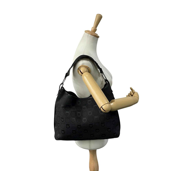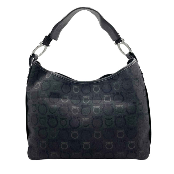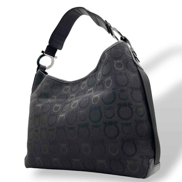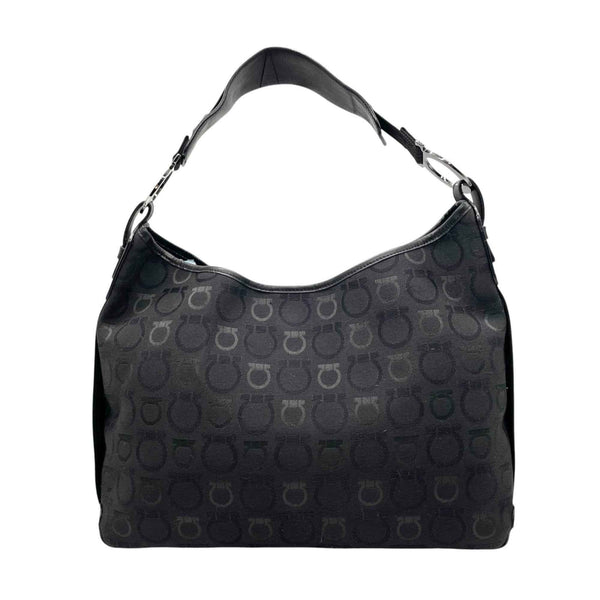 Salvatore Ferragamo Gancini Shoulder Bag, Tote Black Canvas, Silver Hardware, Logo, One-Shoulder C3