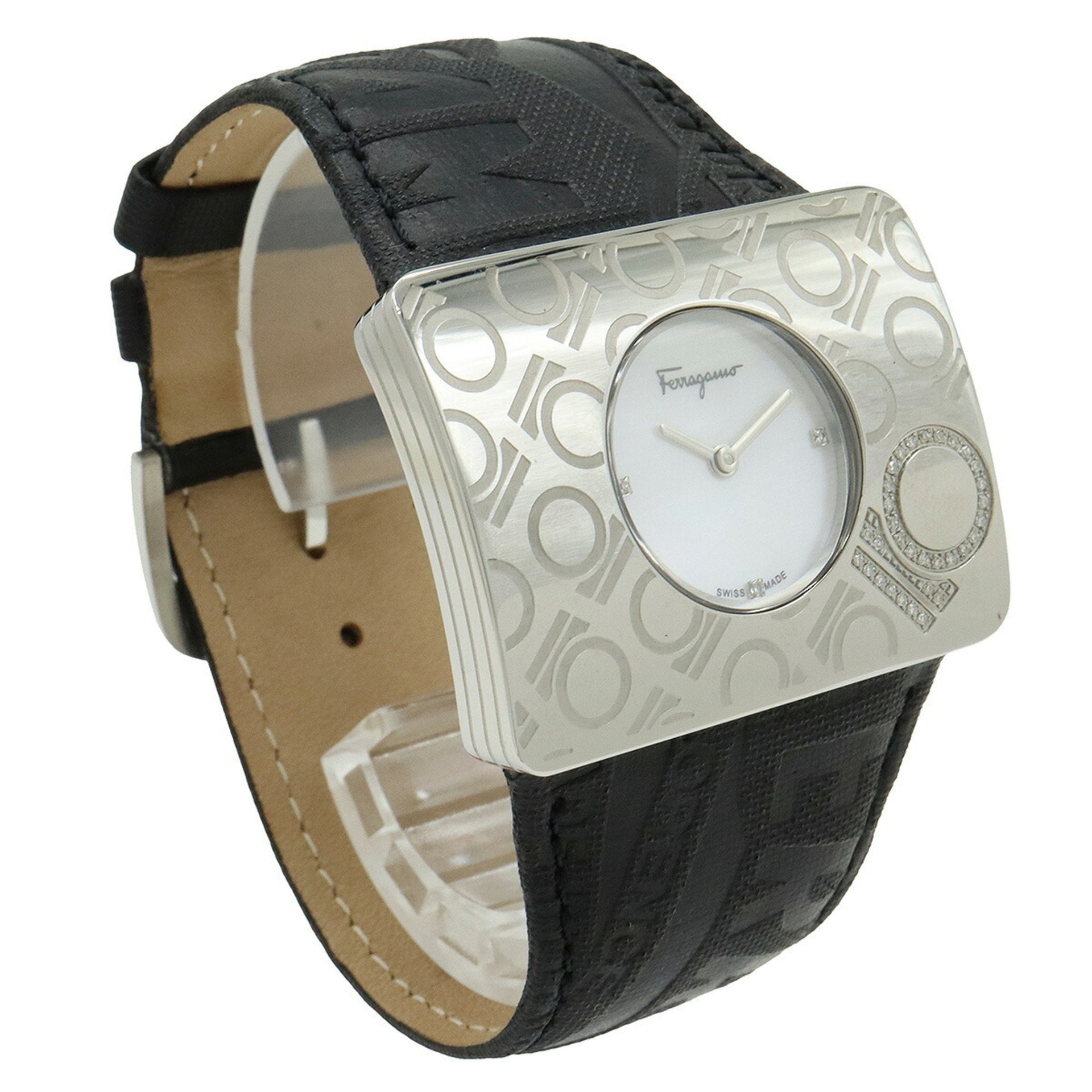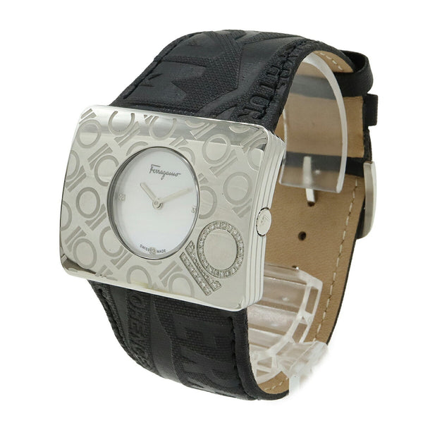 Salvatore Ferragamo Women\'s Quartz Watch F65 with Shell Dial, Diamonds, Stainless Steel, and Leather Strap