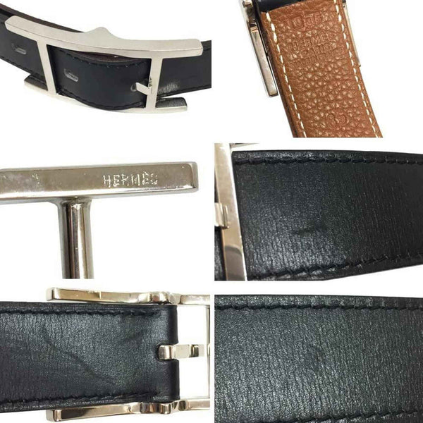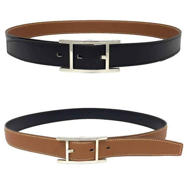 Hermes Hermès Easy Belt, Size 85, □I Stamp, Reversible Leather, Black/Camel Brown, H Buckle, Silver Box Calf/Clemence Leather