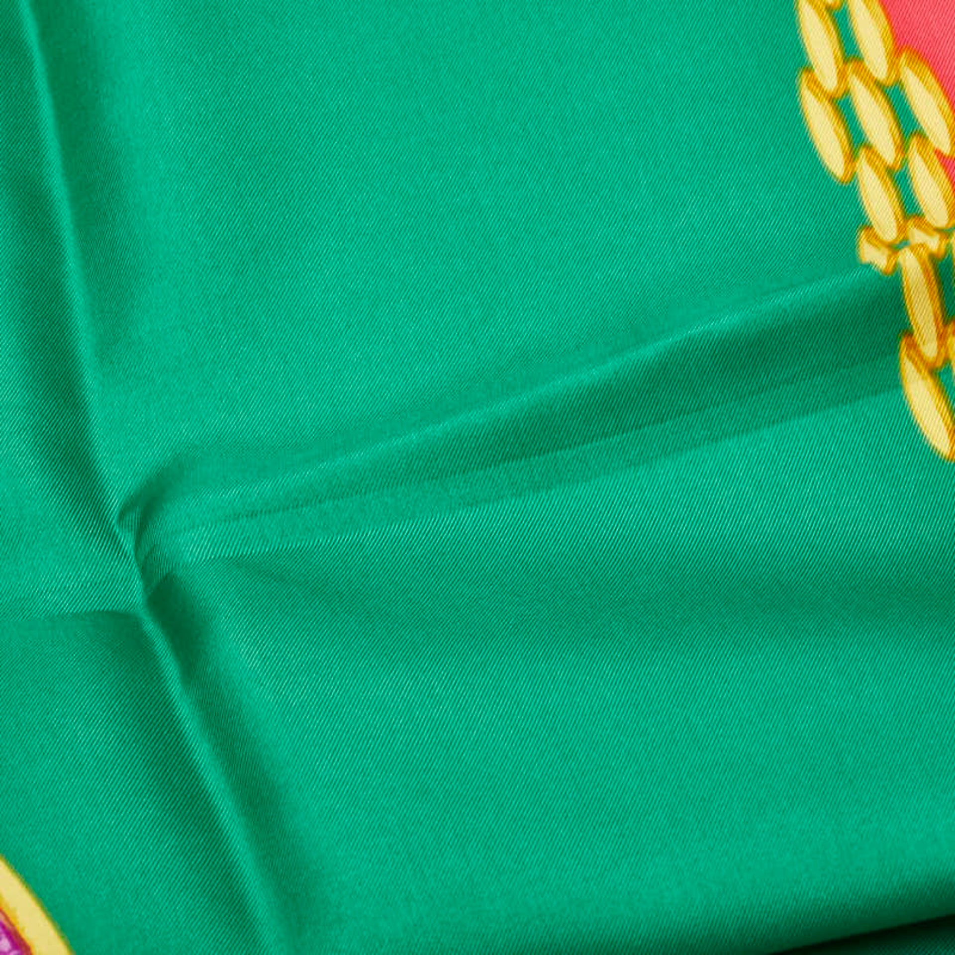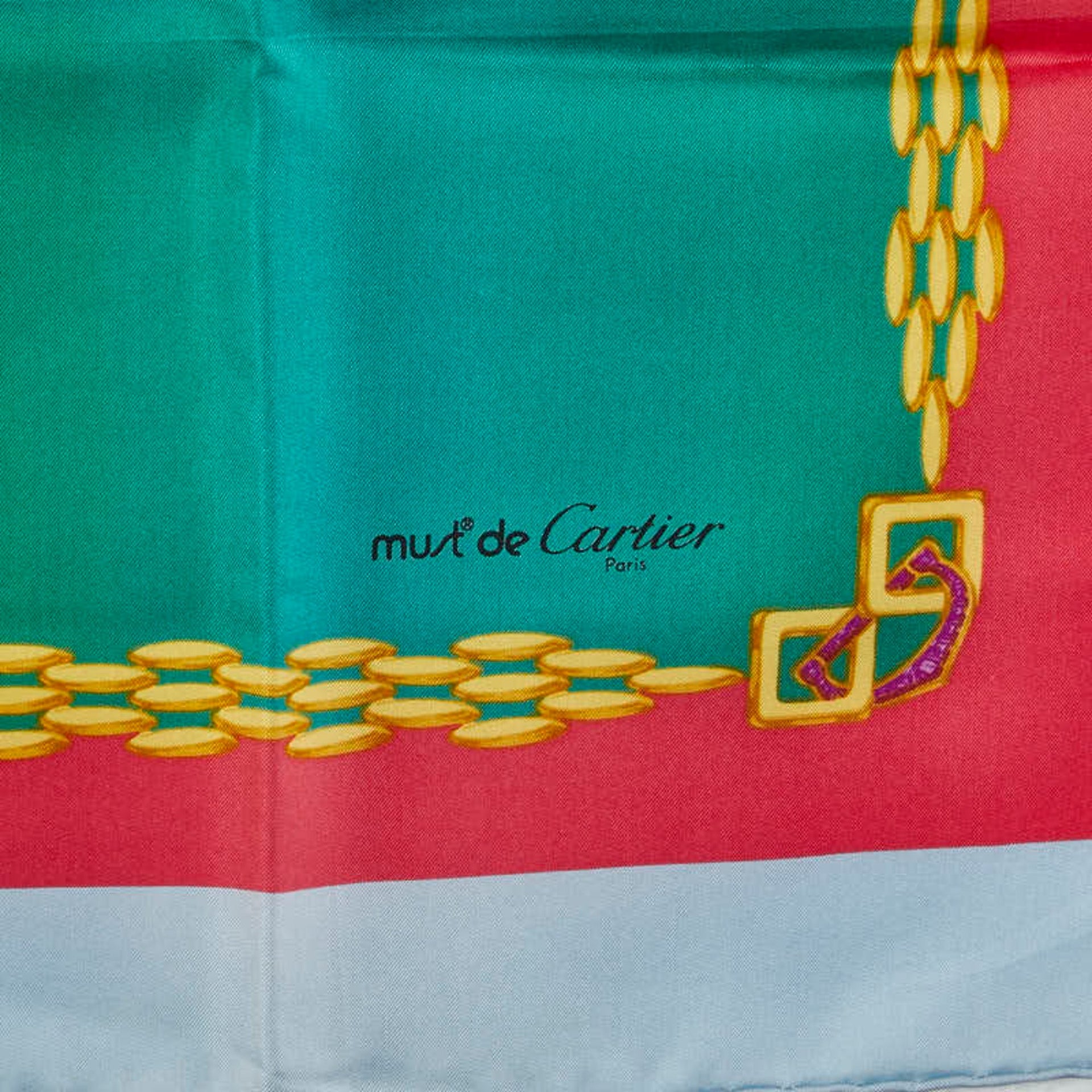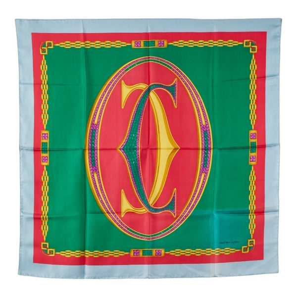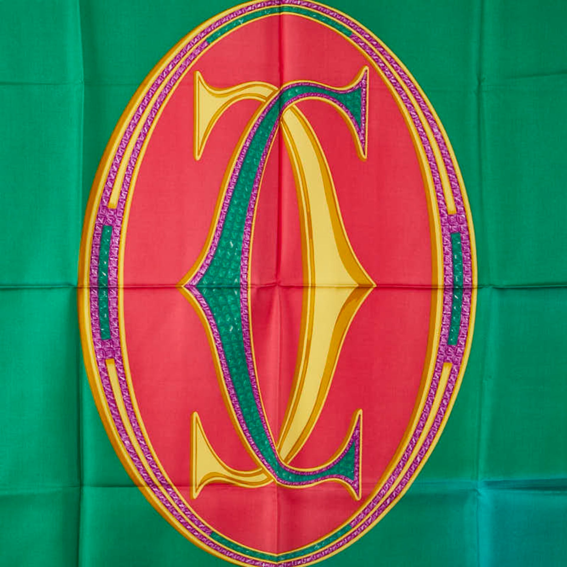 Cartier logo scarf/muffler in red, green, and yellow silk for women.