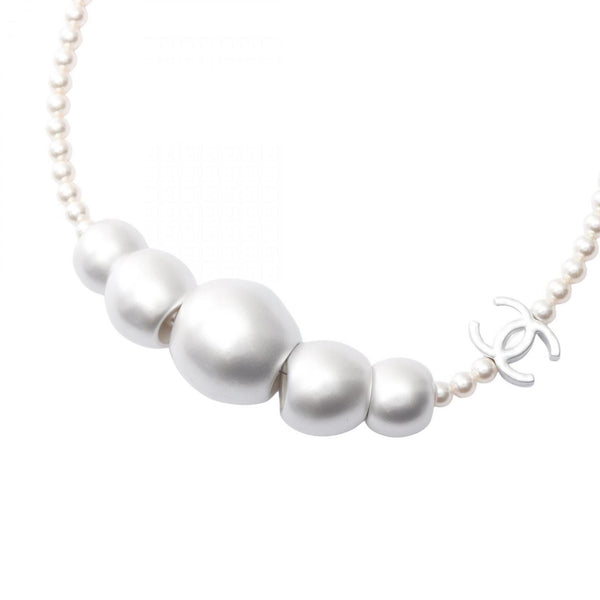 Chanel Coco Mark Necklace in Stainless Steel with Faux Pearls, Silver and White, ABE925B19296