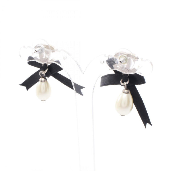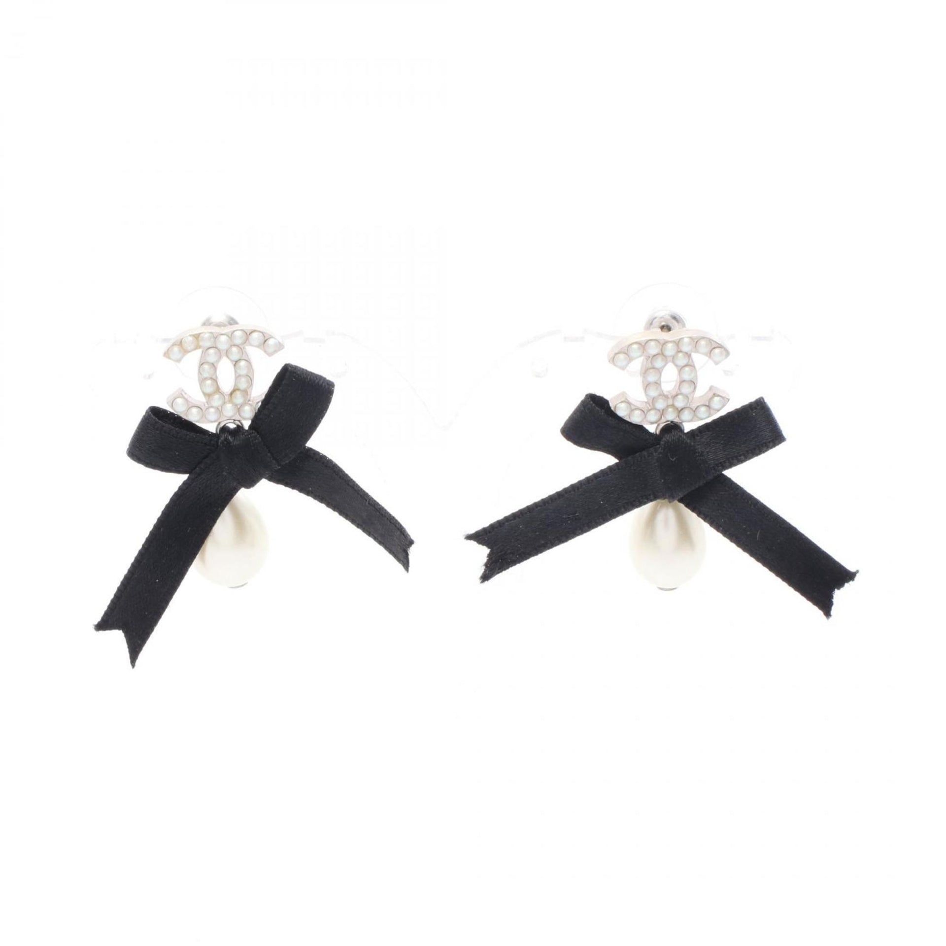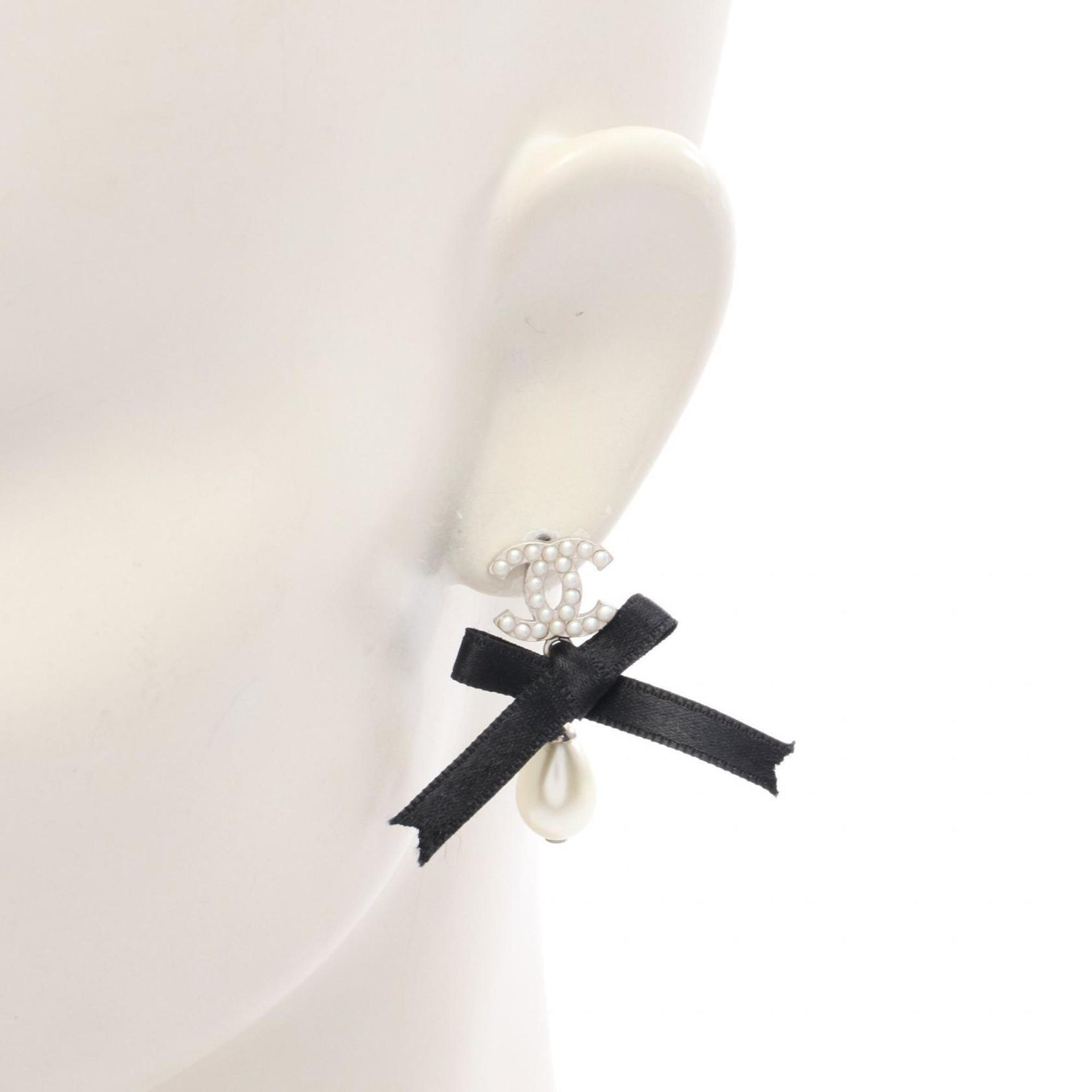 CHANEL Coco Mark Ribbon Earrings, Gold Plated with Faux Pearls, Women\'s, Available in Gold, White, and Black