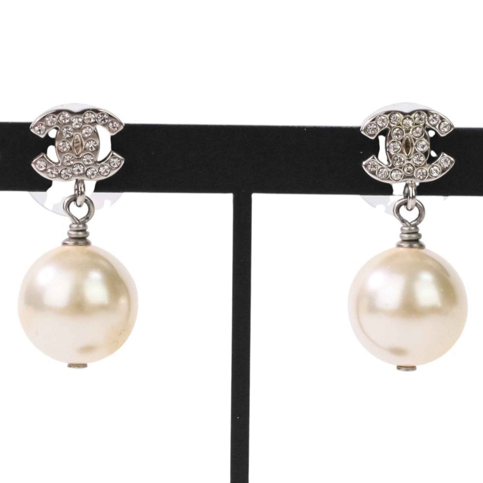 Chanel Faux Pearl & Rhinestone Coco Mark Stud Earrings in White and Silver