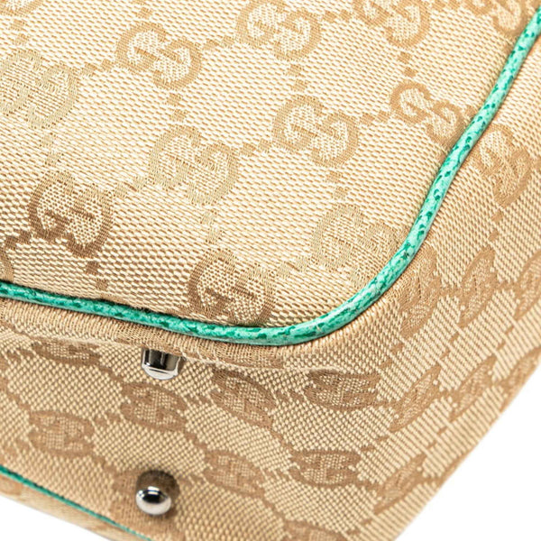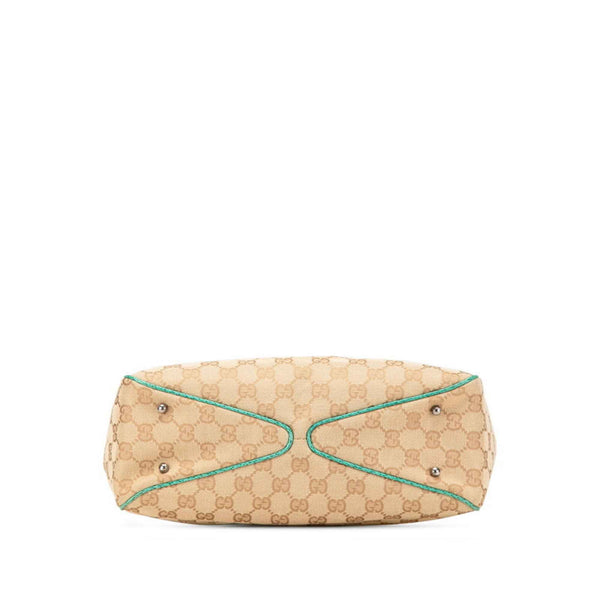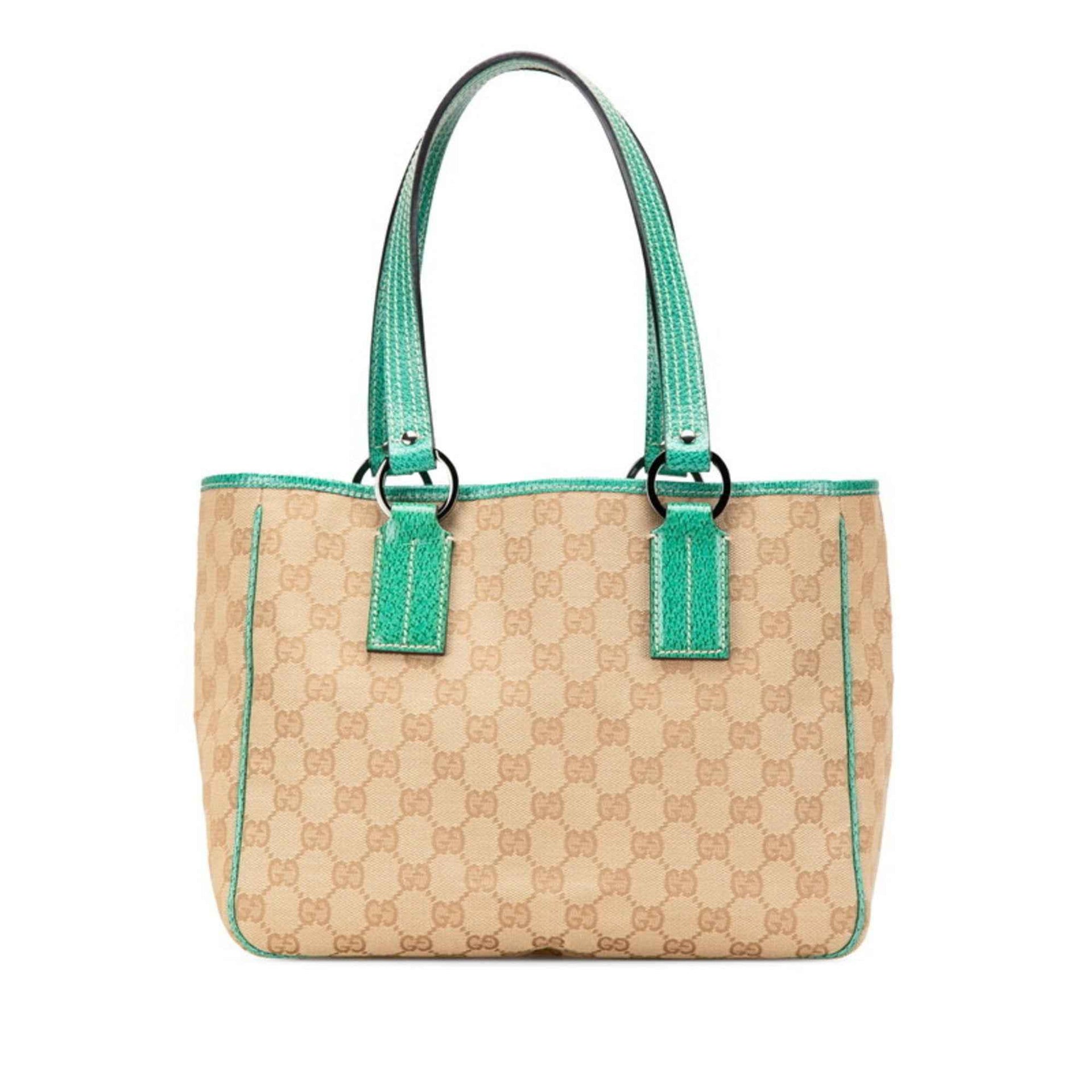 Gucci GG Canvas Tote Bag 113019 Beige Emerald Green Leather Women\'s GUCCI