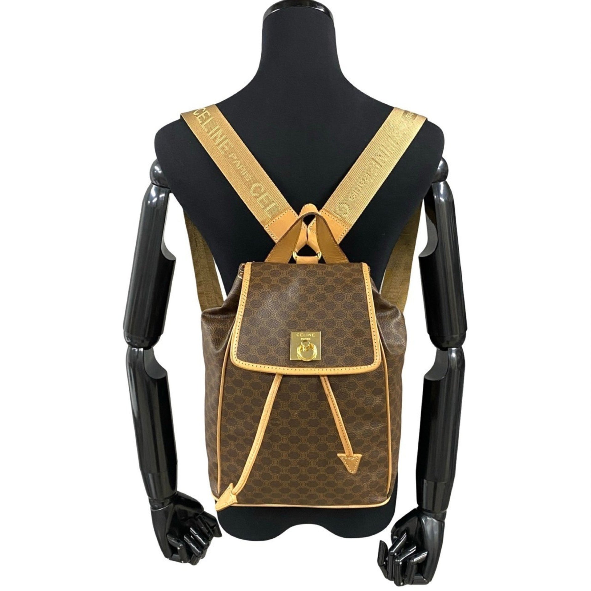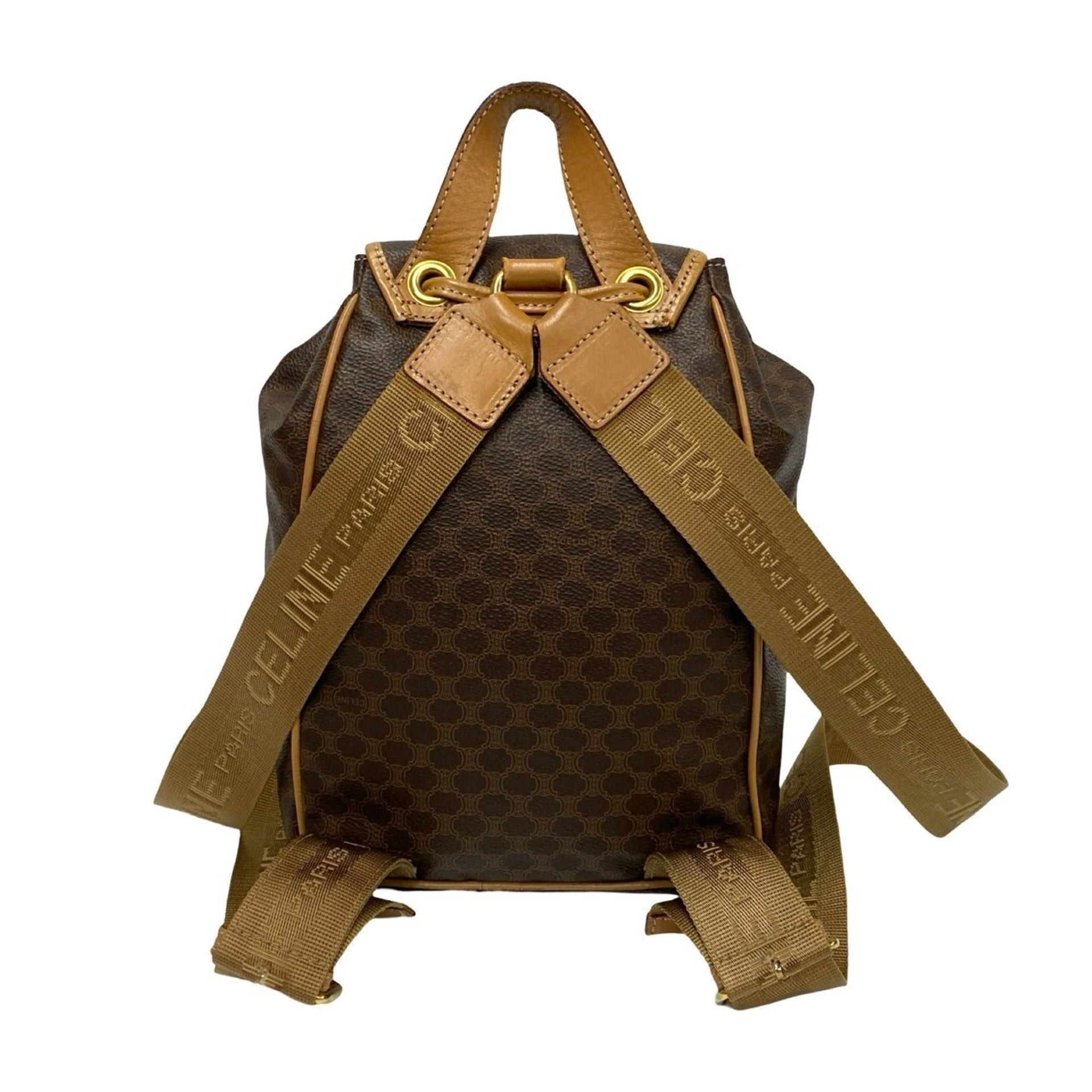 CELINE Vintage Macadam Blason Pattern with Logo and Ring Hardware, Leather Backpack, Brown, d35-9