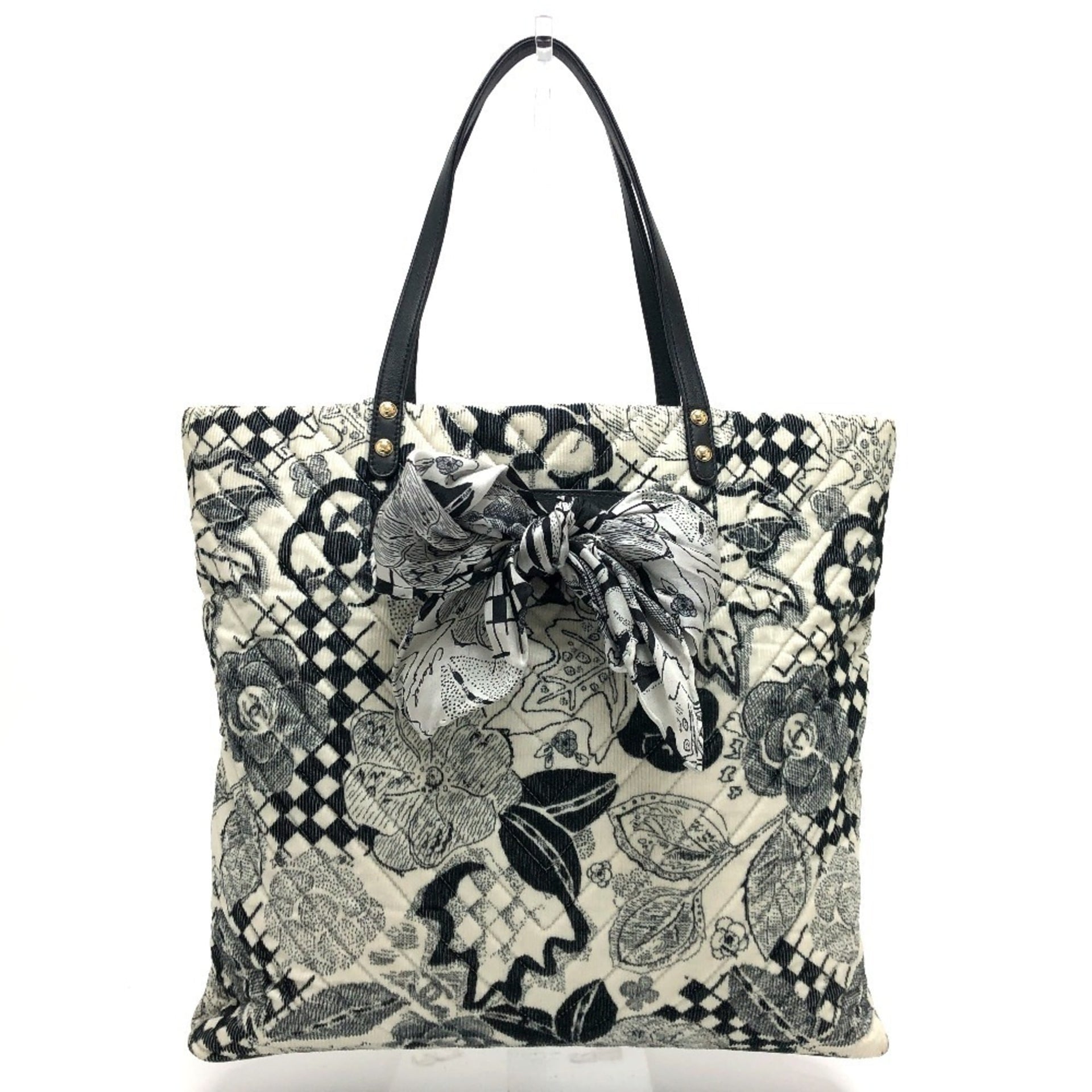 CHANEL Camellia Bag Chevron Corduroy Shoulder Ribbon Handbag Tote Canvas Women\'s White