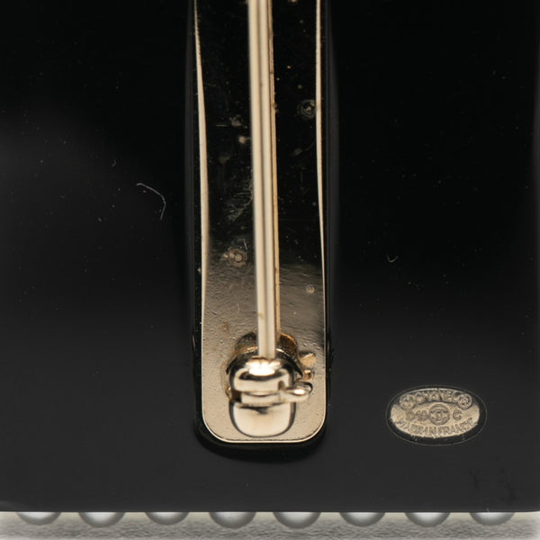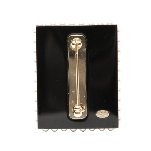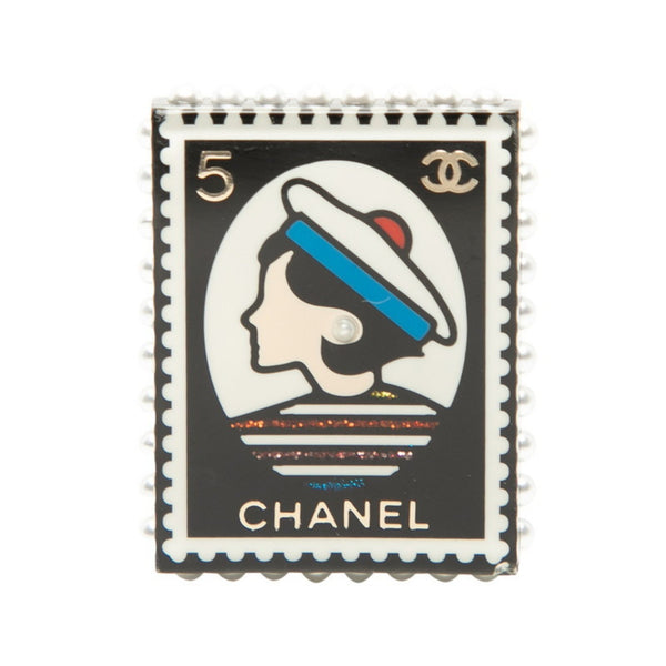 Chanel Coco Mark 5 Mademoiselle Stamp Motif Brooch in Black, White, and Multicolor Plastic with Plated Design for Women