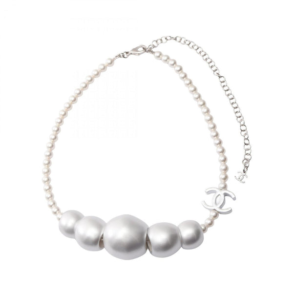 Chanel Coco Mark Necklace in Stainless Steel with Faux Pearls, Silver and White, ABE925B19296