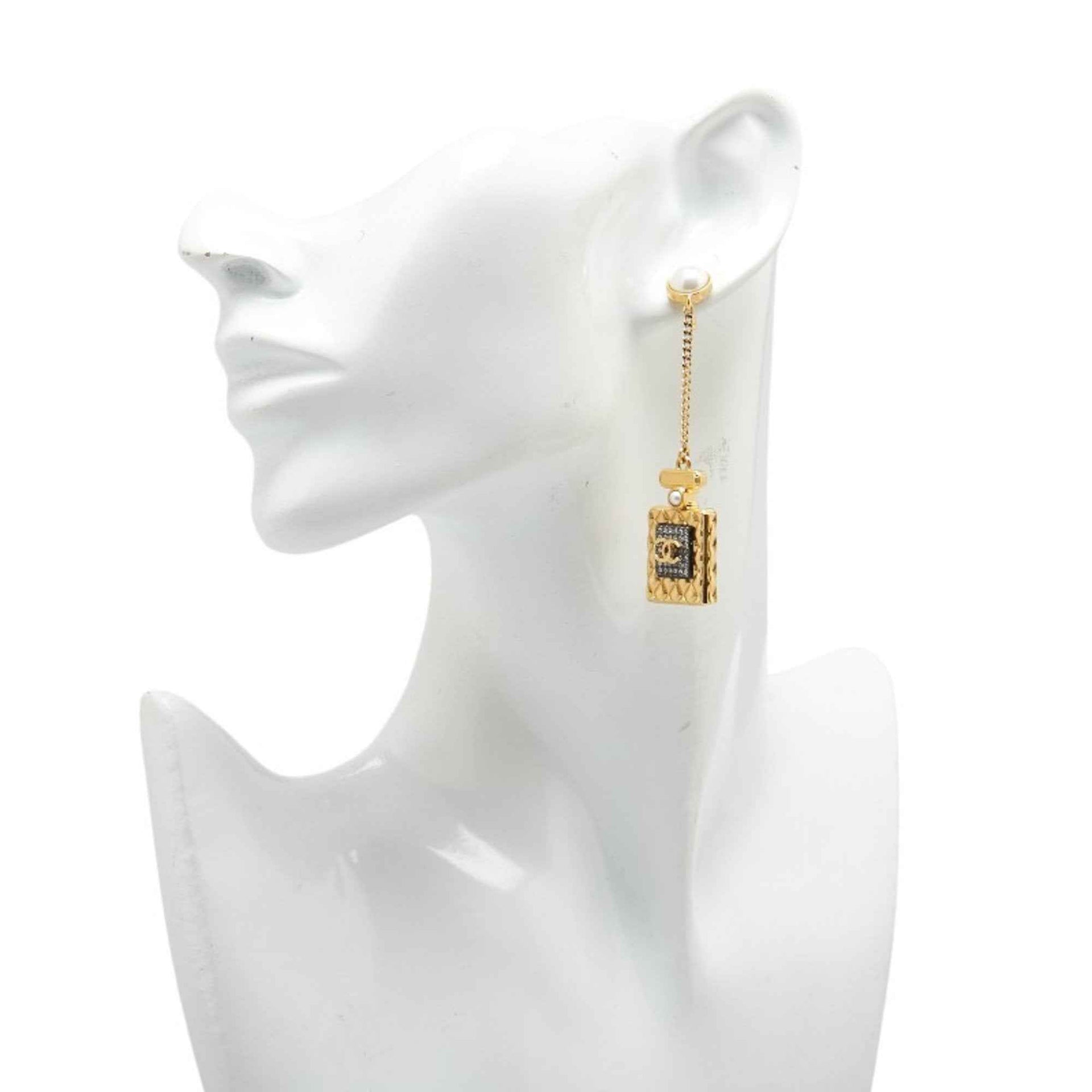 Chanel Coco Mark perfume bottle motif rhinestone earrings, gold plated with faux pearls, women\'s.