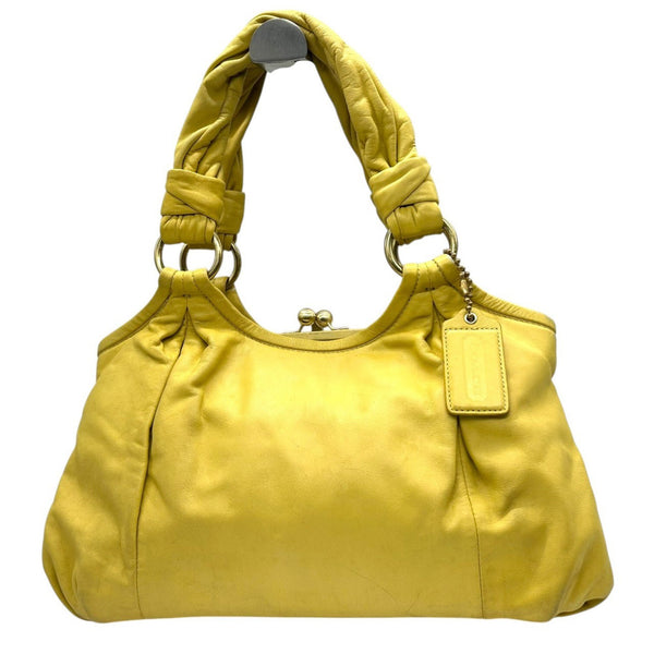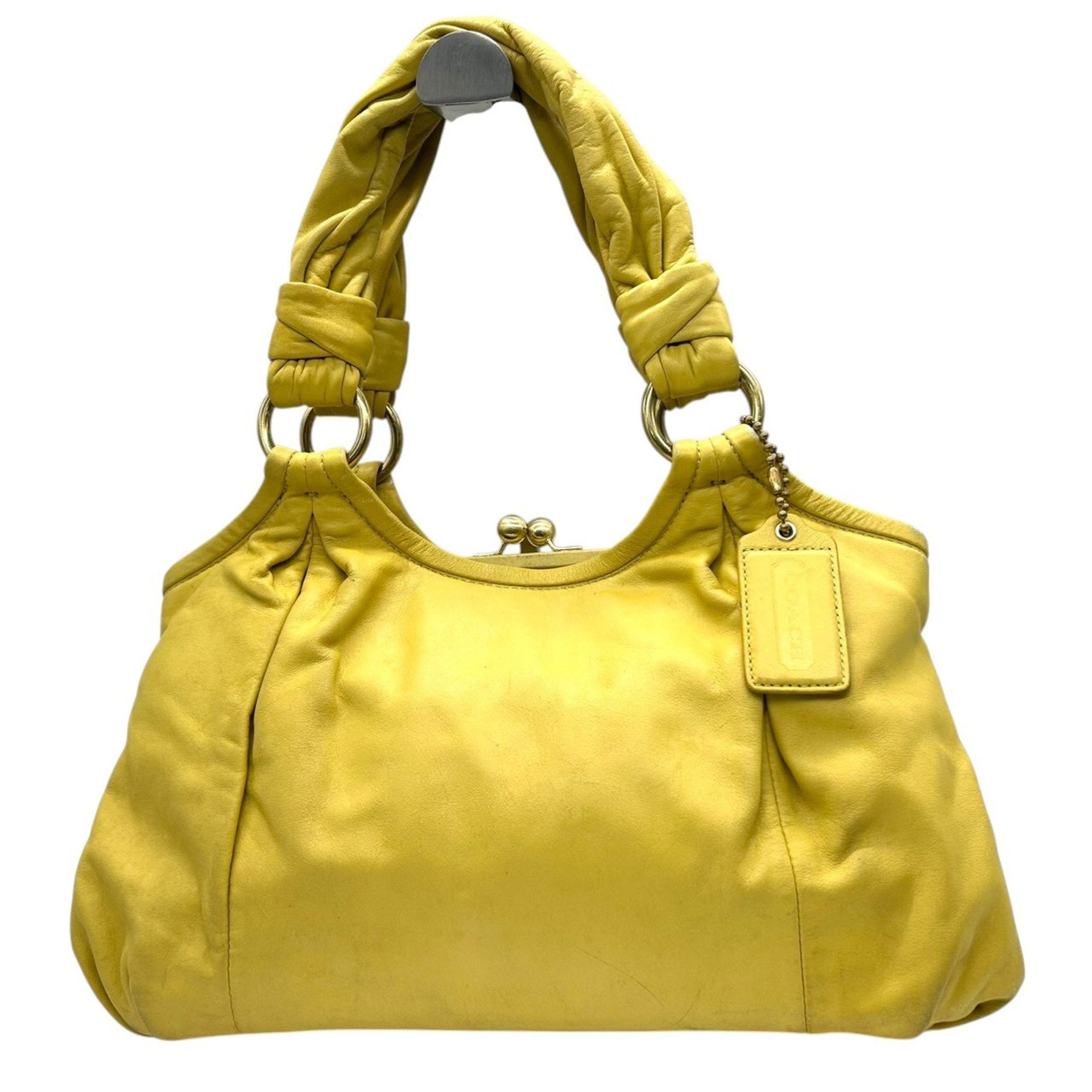 Coach Brooke handbag (13437) in yellow leather with a kiss-lock clasp closure. This one-shoulder bag features gathered design and gold hardware. Features include charm Size s40.