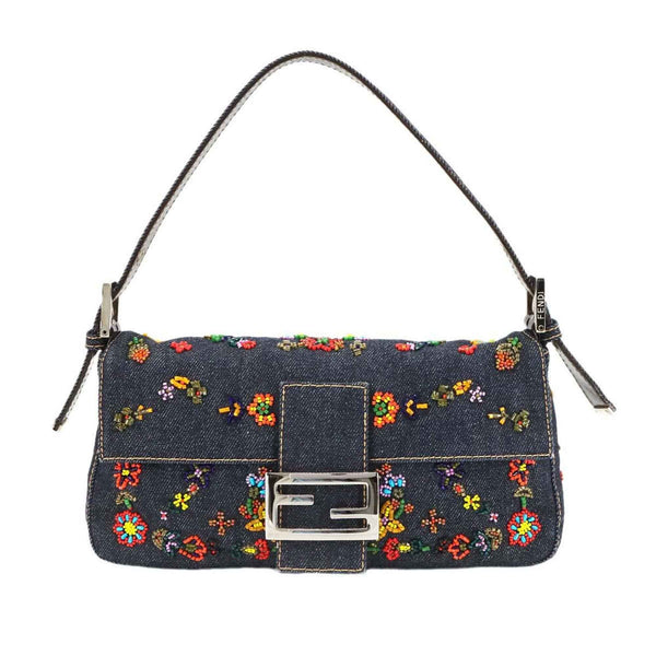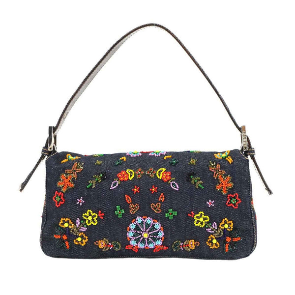 FENDI Zucca Mamma Baguette Shoulder Bag in Navy and Multicolor Denim, 26424, with Beaded Embroidery, Floral Pattern, Silver Hardware