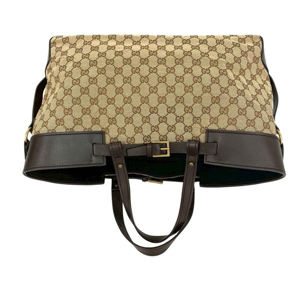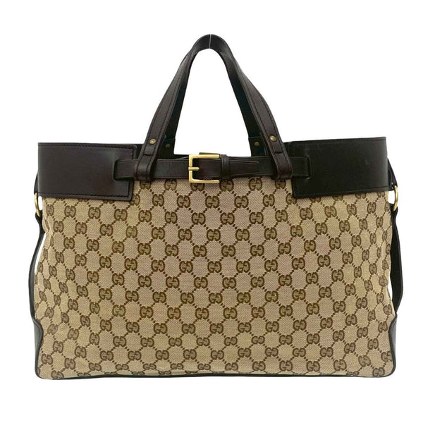 GUCCI GG logo belt clasp canvas and leather tote bag, handbag, business brown, 04393