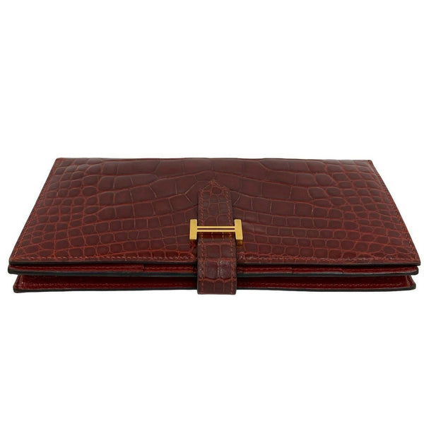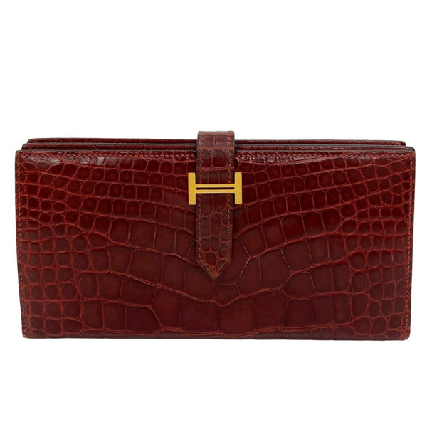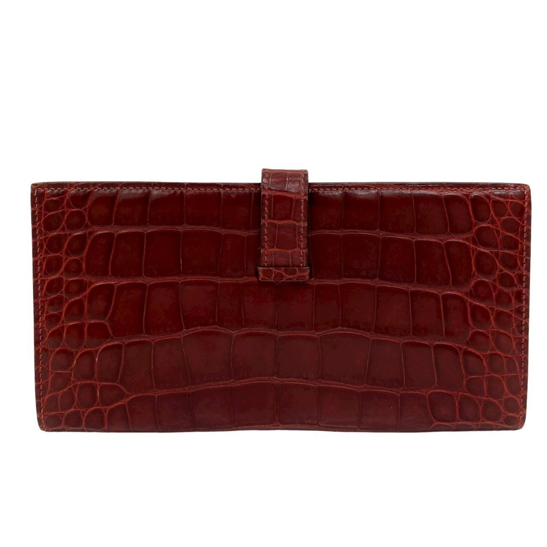 HERMES Bearn Soufflet logo hardware alligator leather bifold long wallet brown 21385