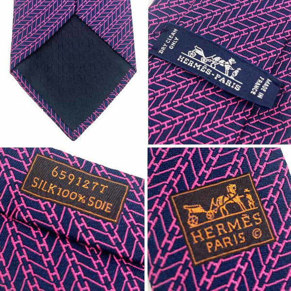 Hermes HERMES tie H pattern 100% silk navy x pink men\'s