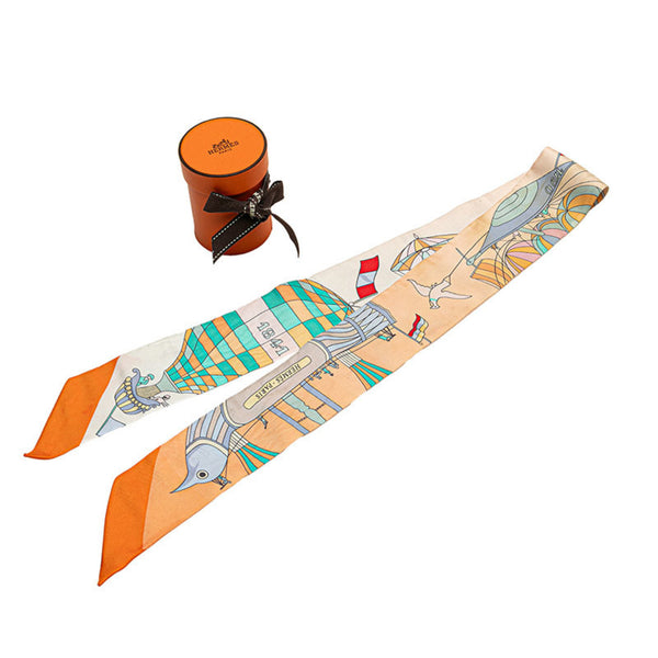 Hermes Hermès Twilly \"Les Folies du Ciel\" scarf, orange, beige, multicolor, silk, women\'s.