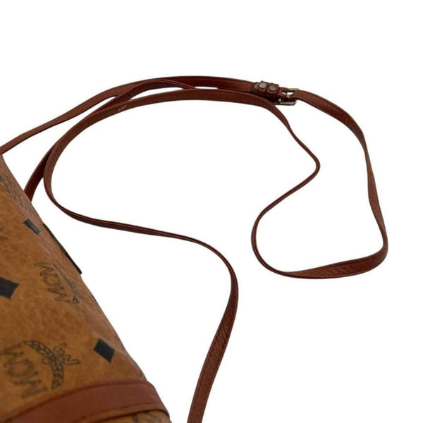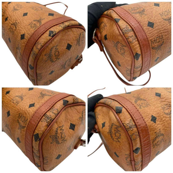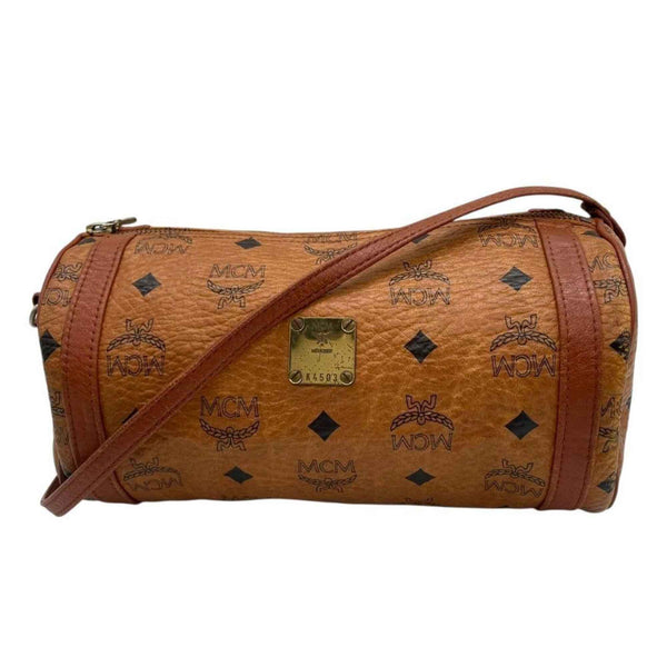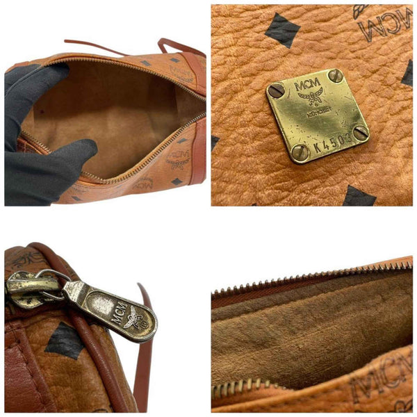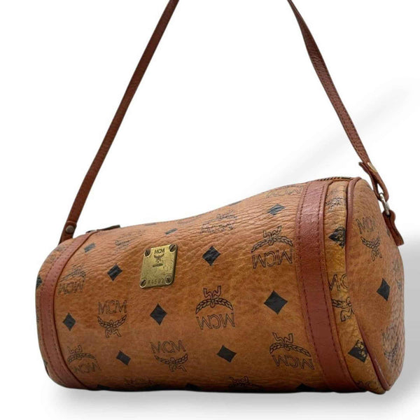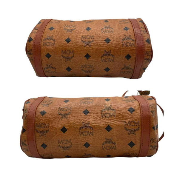 MCM Brown Visetos Mini Boston Shoulder Bag, Leather with Gold Hardware and Logo Plate, K4503