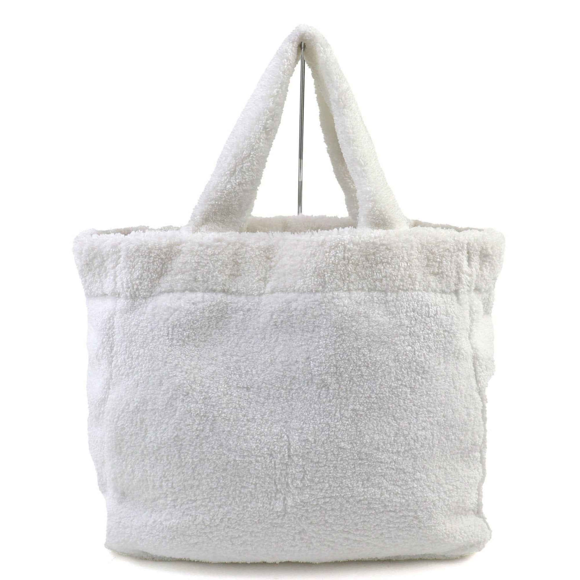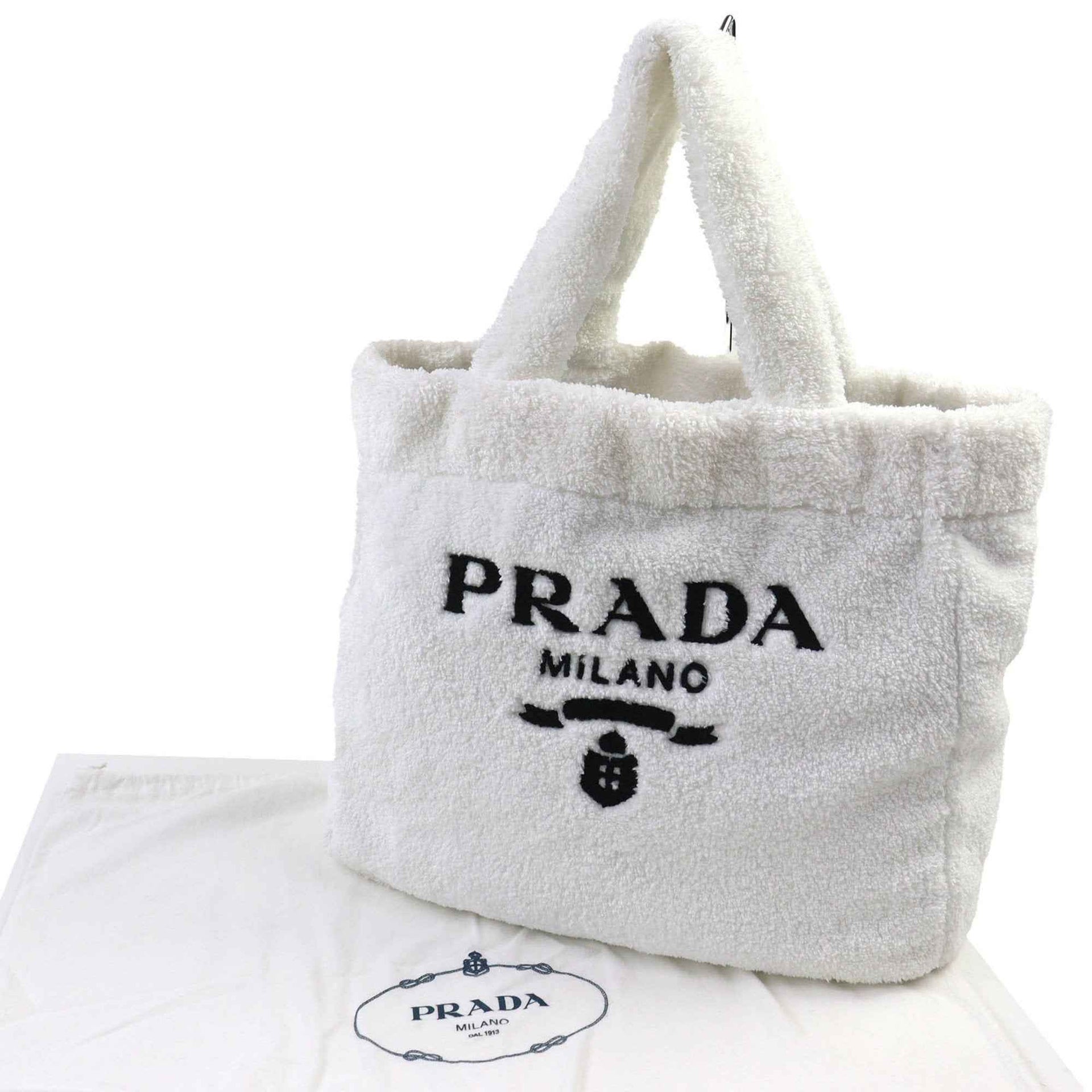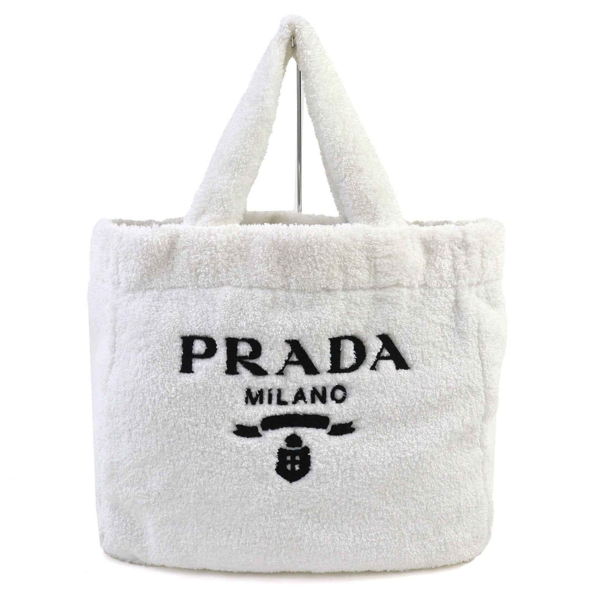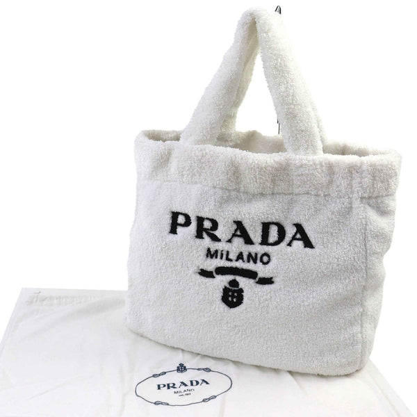 PRADA SPUGNA 1BG130 Polyester and Cowhide Leather Triangle Logo Soft Terry Lettering Pile Tote Bag in White Black, Includes Dust Bag, Women\'s