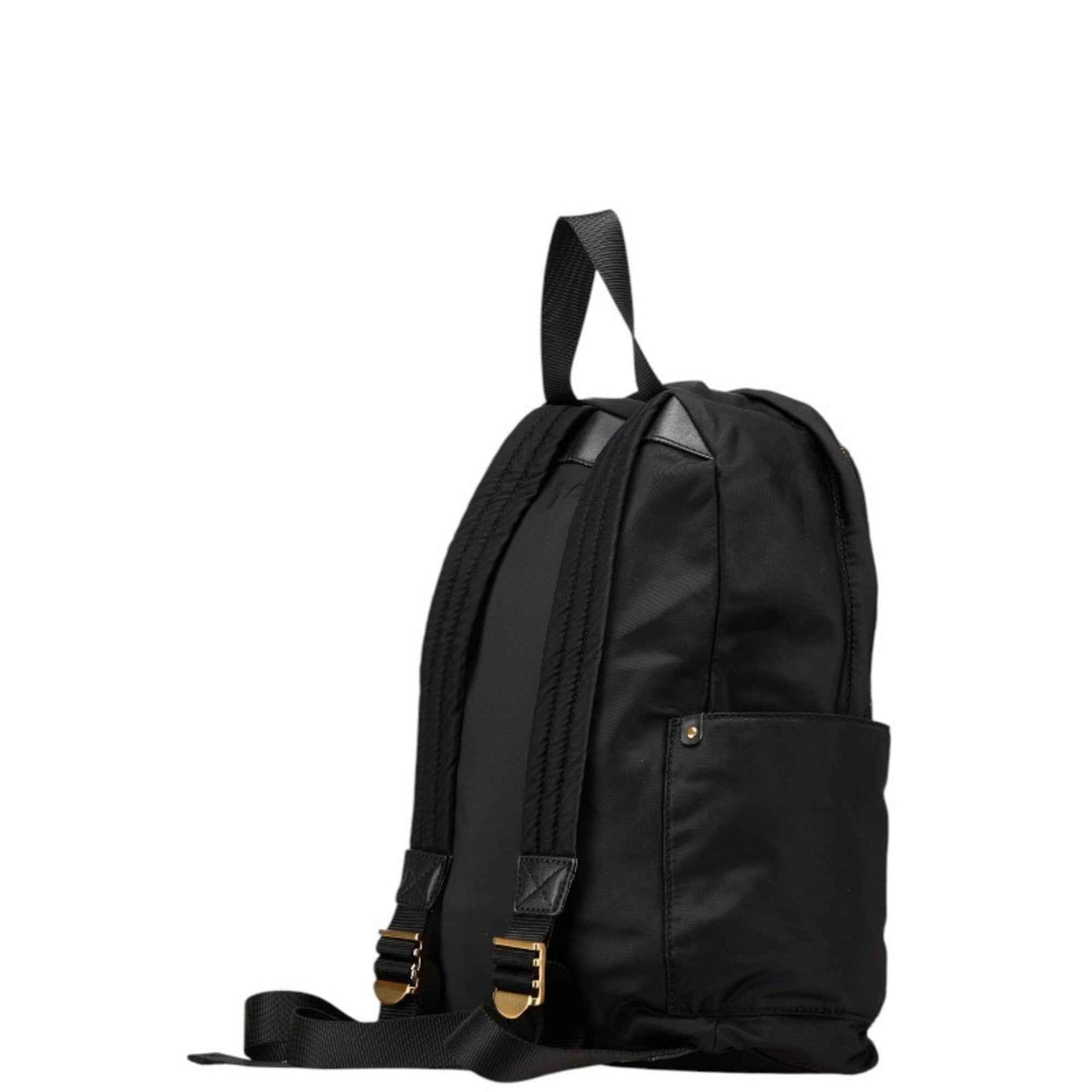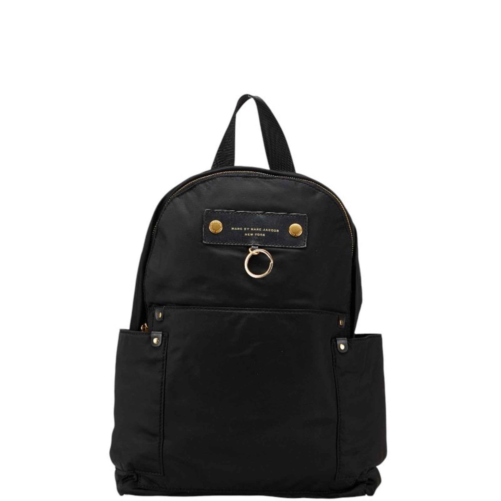 Marc Jacobs logo backpack in black and gold nylon leather for women.