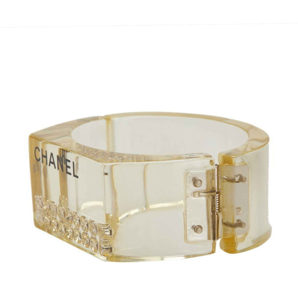 CHANEL logo bangle in yellow, clear plastic with rhinestones, for women.