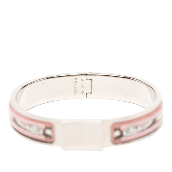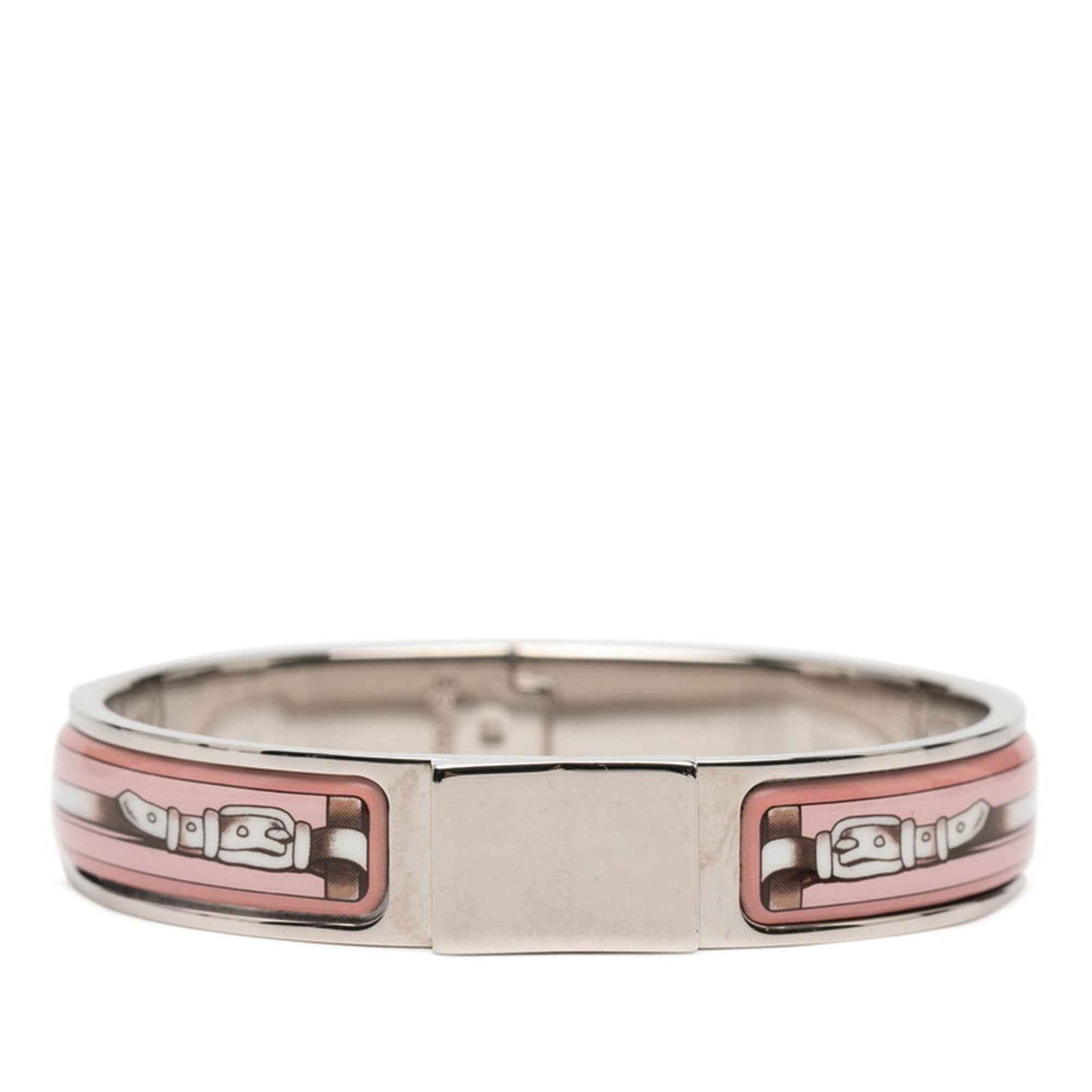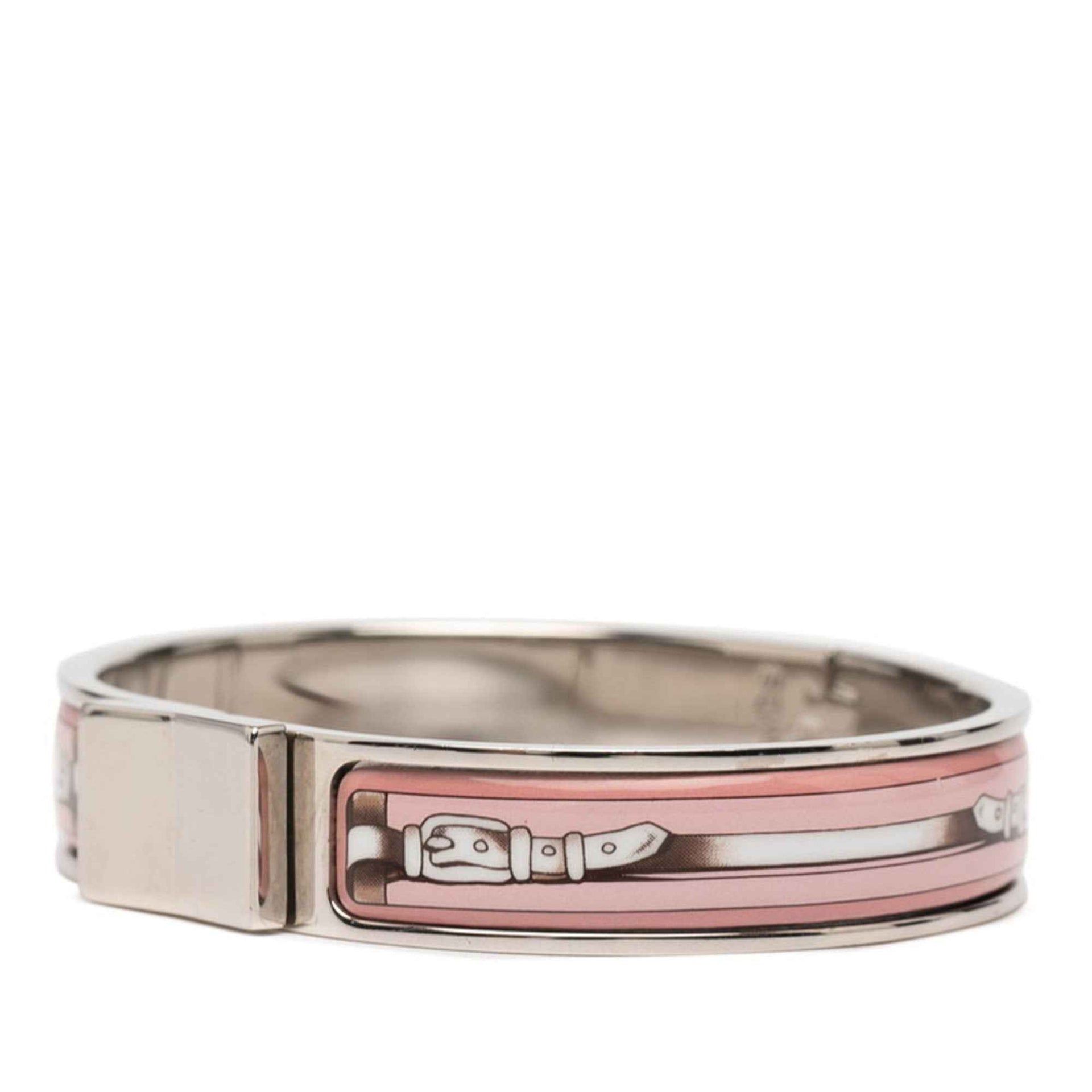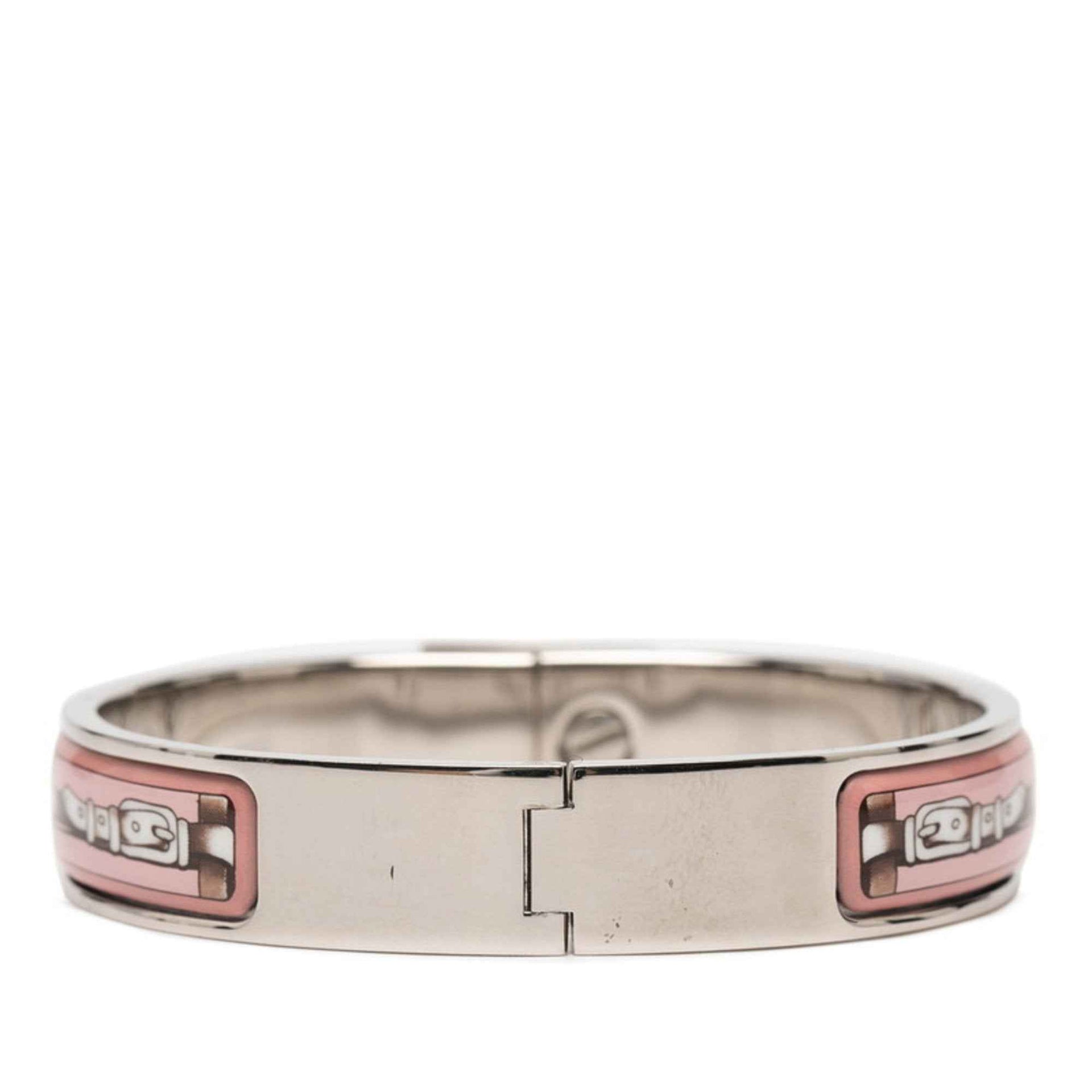 Hermes enamel PM belt motif bracelet bangle in silver and pink metal for women.