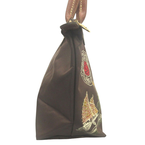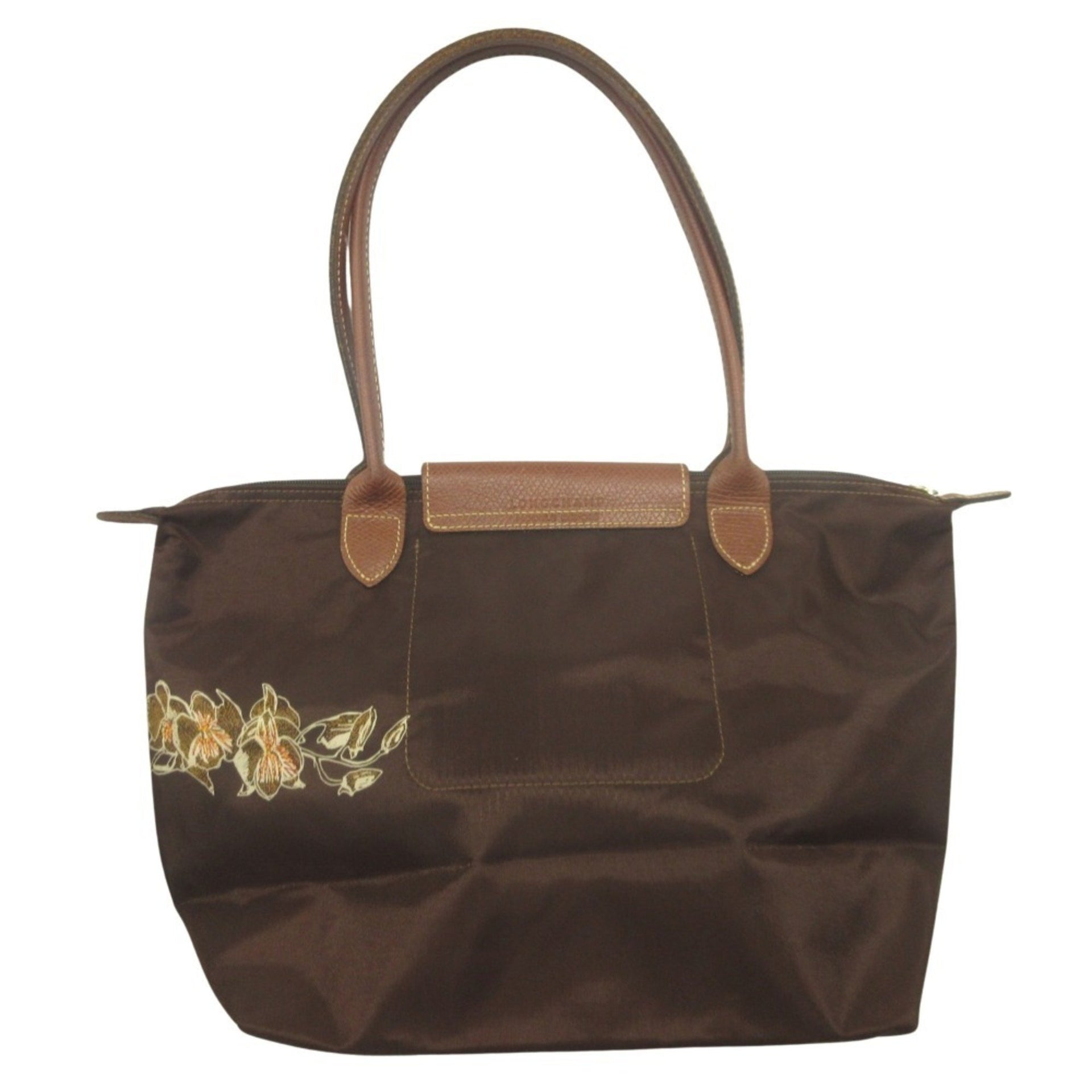 LONGCHAMP Le Pliage Cuir Tote Handbag with Vietnamese Embroidery and Leather Patch, Brown, Women\'s