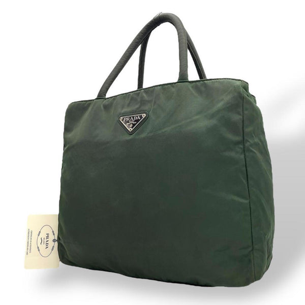 Prada Tessuto Nylon Handbag with Triangle Logo, Khaki Green, Tote Bag, Compact, Nylon, Silver Hardware, Prada, Women\'s