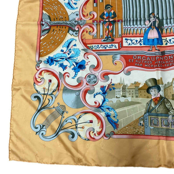 HERMES Carré 90 ORGAUPHONE ET MECHANIQUES (Pipe Organ and Mechanical Instruments) Silk Scarf/Muffler, Yellow, Women\'s