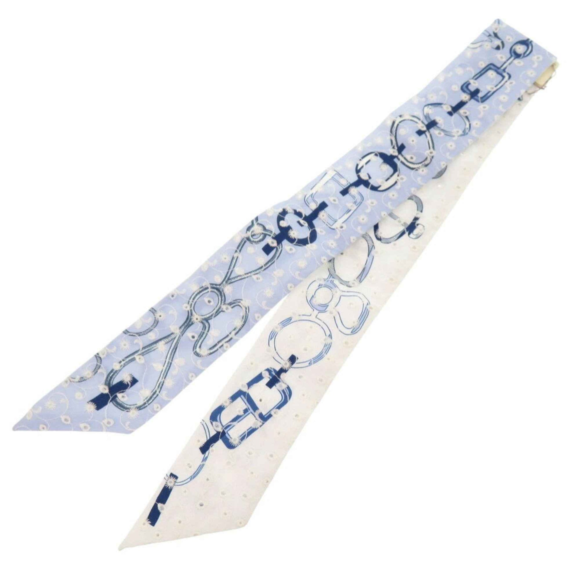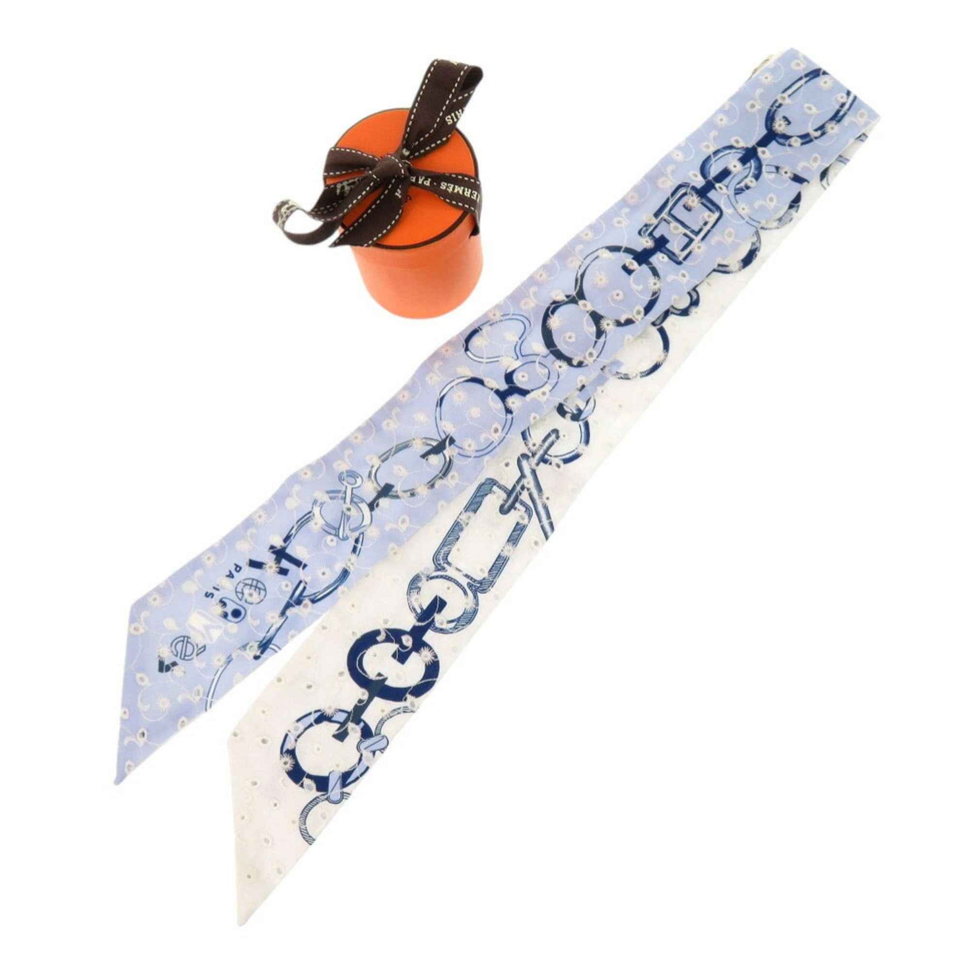 Unused Hermès Twilly de Les Boucles Broderie Anglaise Silk Blue Scarf Muffler 0146 HERMES