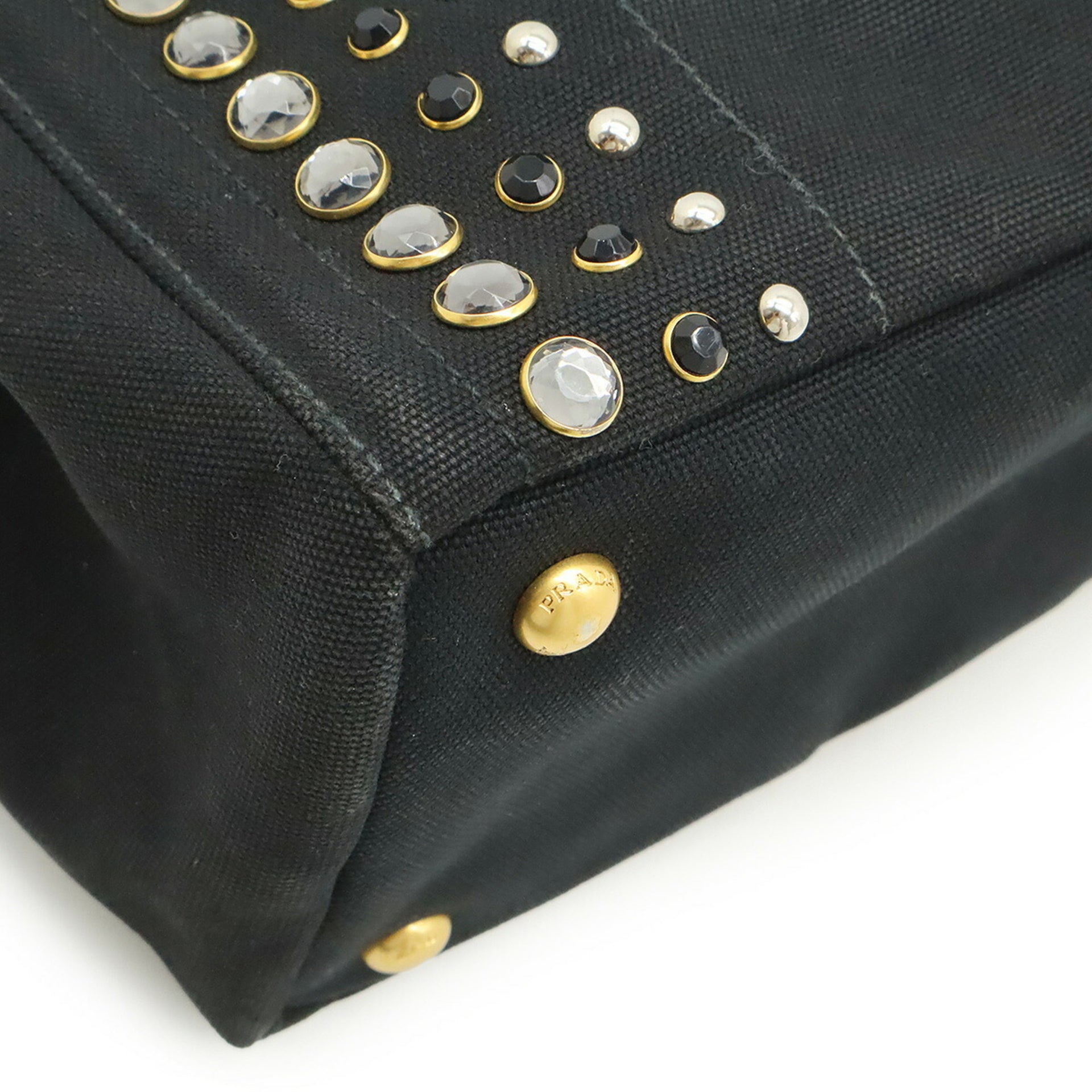 PRADA CANAPA Tote Bag, Beaded Studs, Canvas, Nero, Black, Shoulder 1BG439