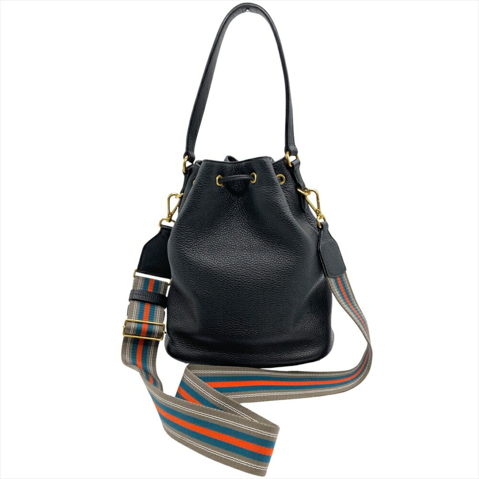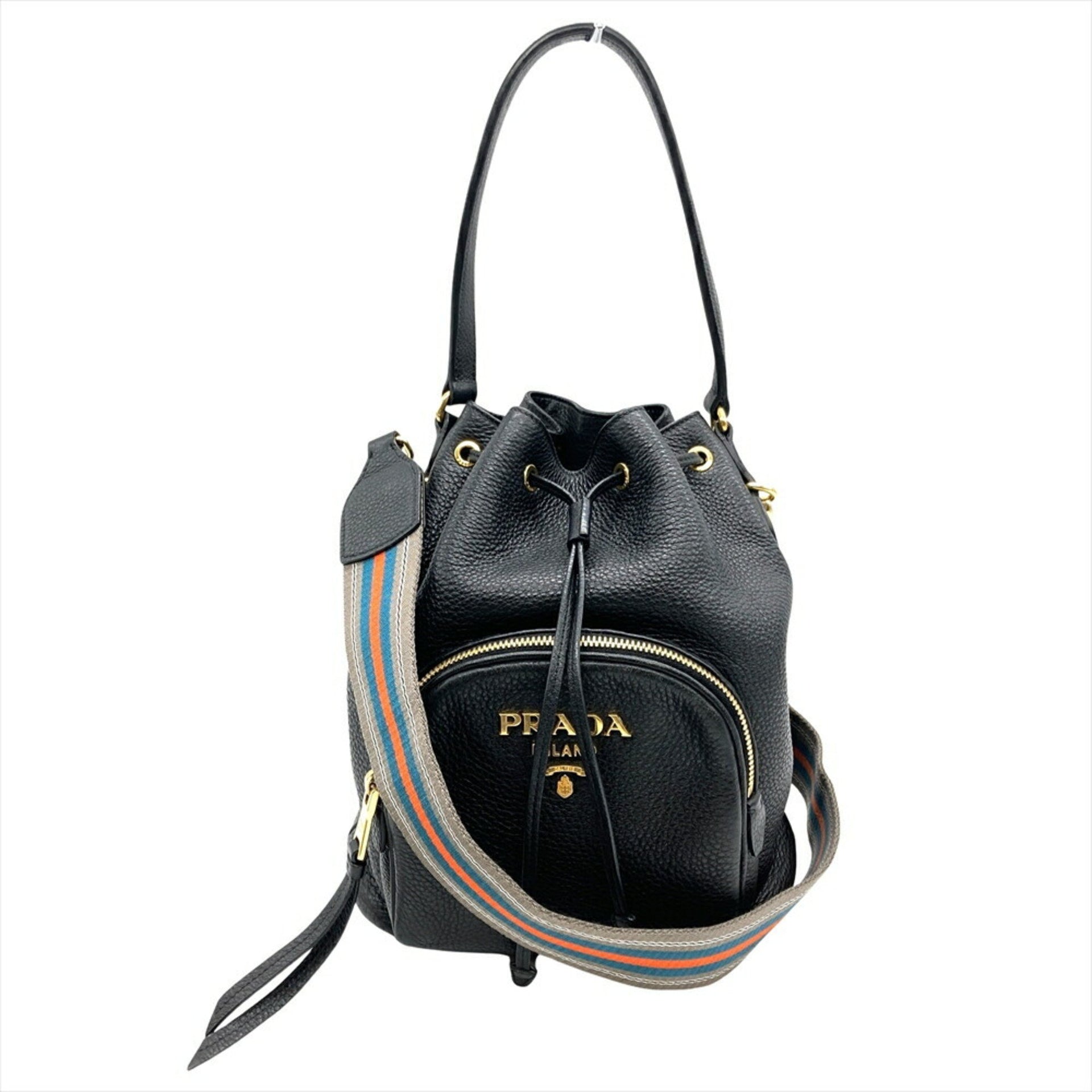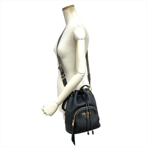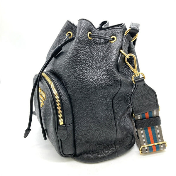 PRADA Vitello Dino Shoulder Bag Leather Black Drawstring for Women