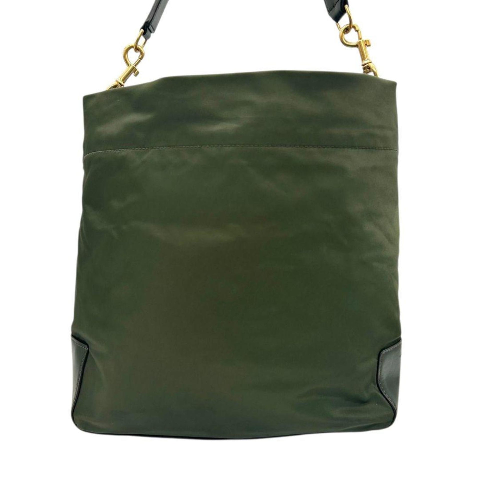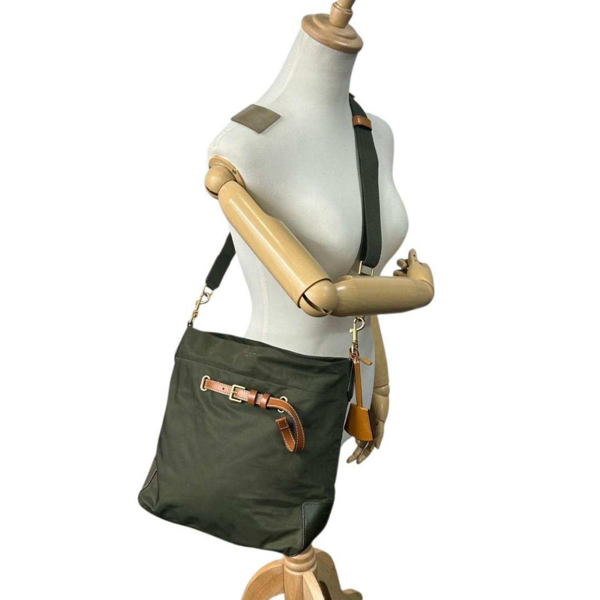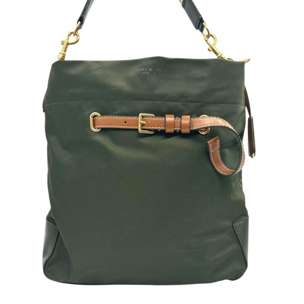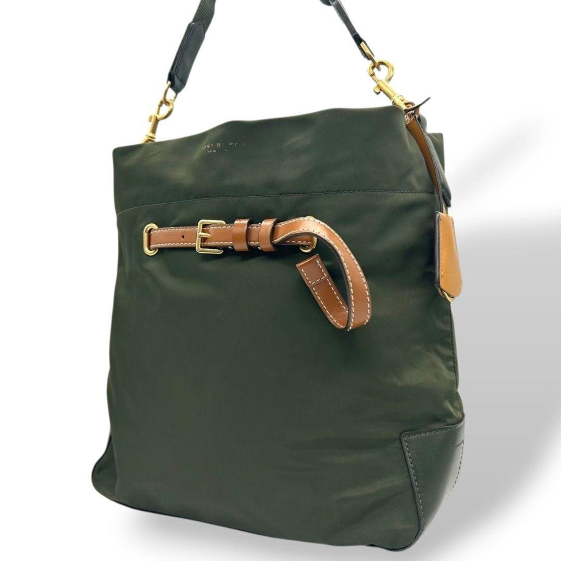 Tory Burch shoulder bag, green nylon, 2-way tote bag/handbag, gold hardware, charm, khaki, brown leather.