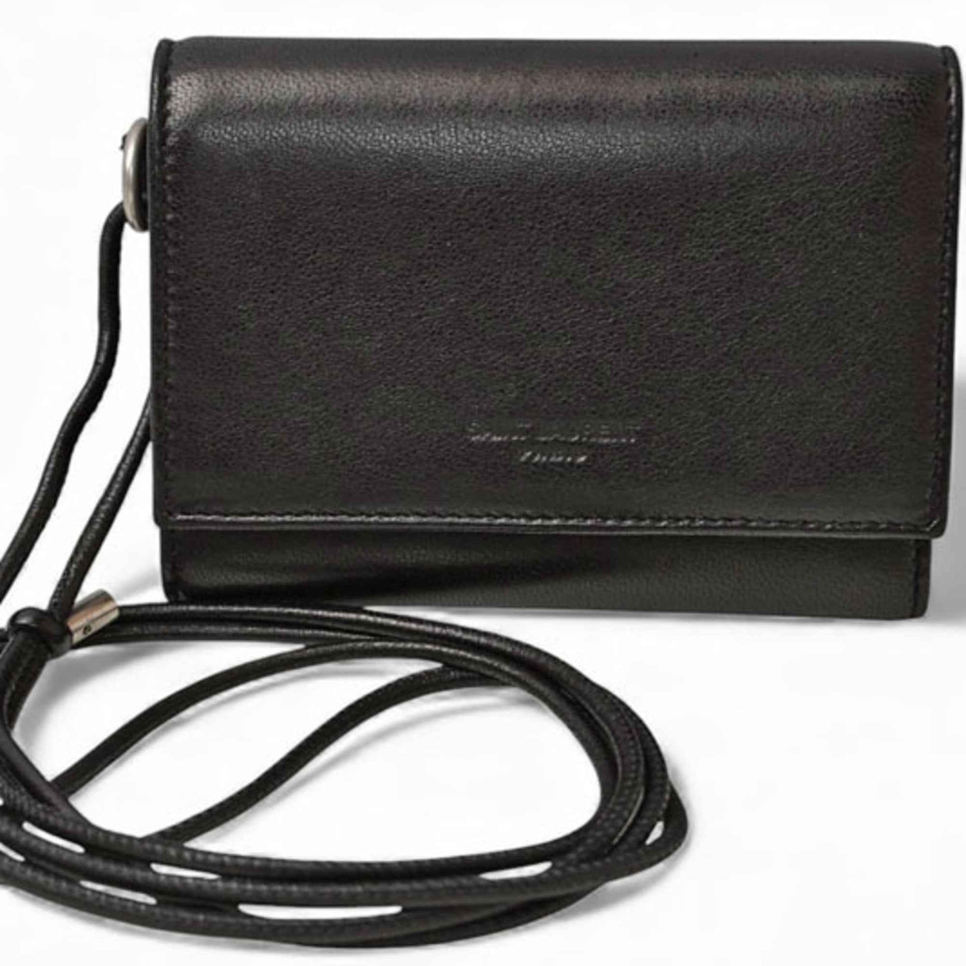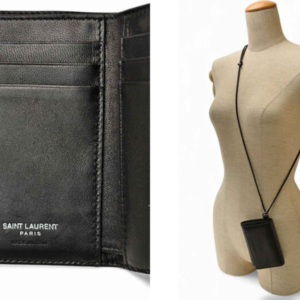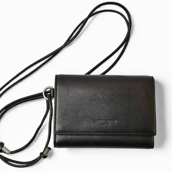 YSL SAINT LAURENT Trifold Wallet in Smooth Leather with Neck Strap, Black, 820355
