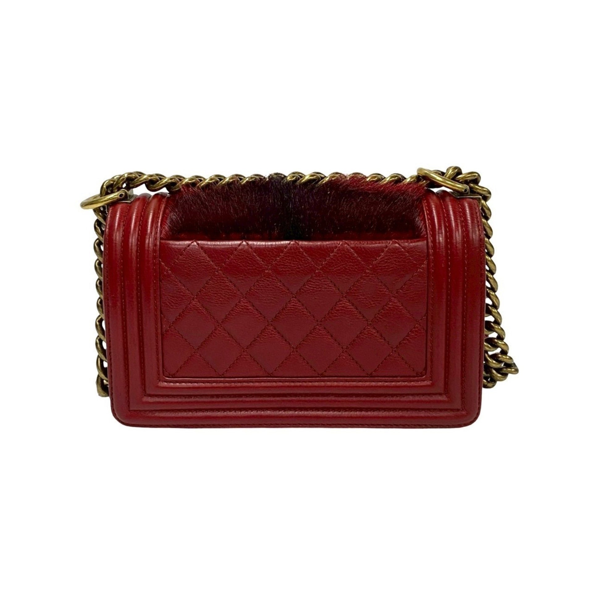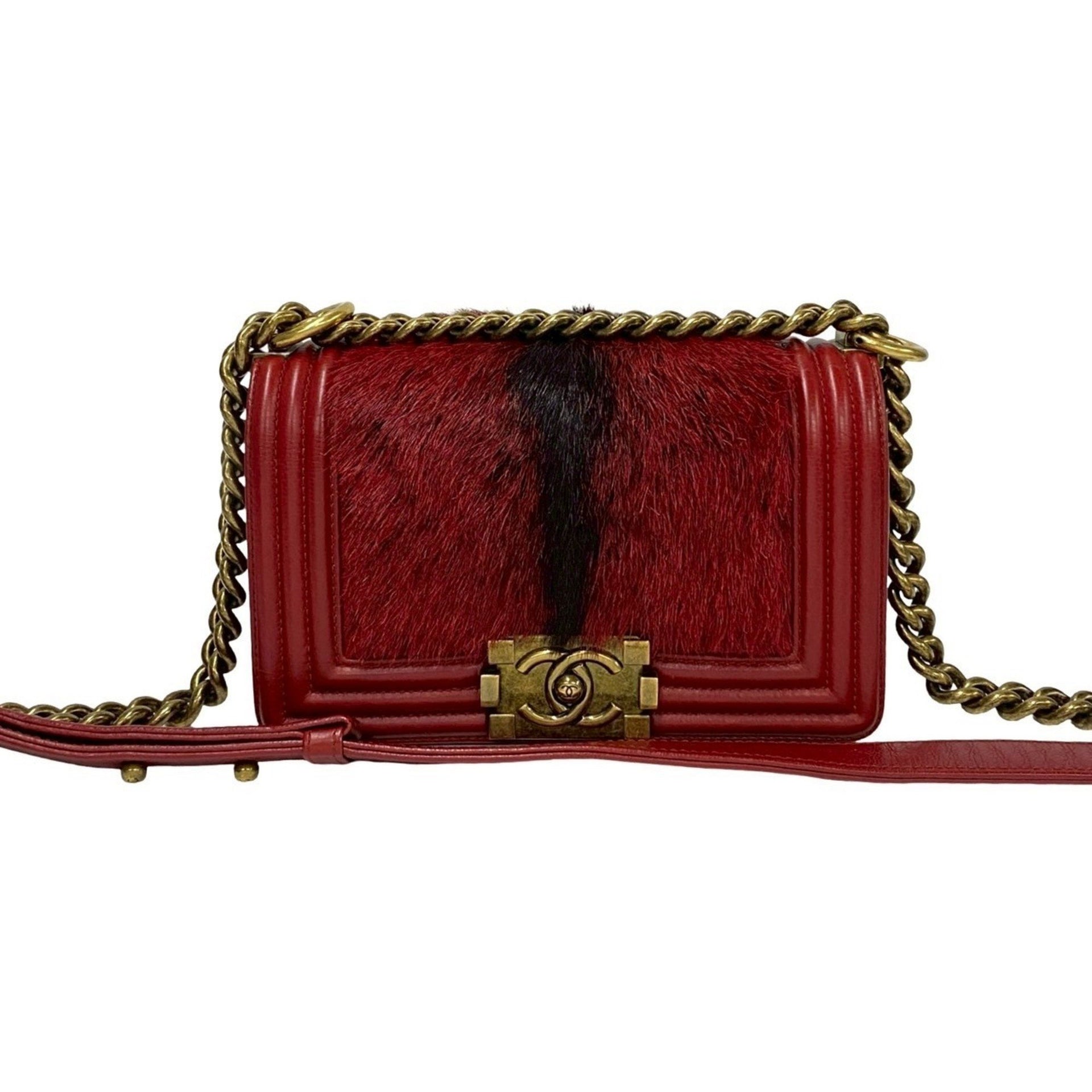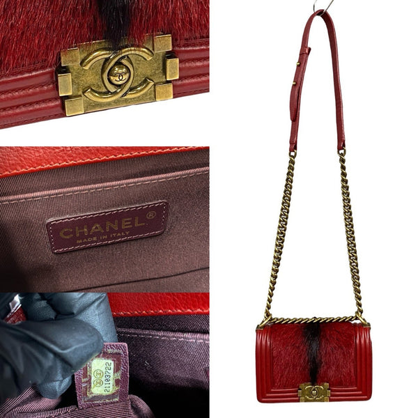 CHANEL Boy Chanel Coco Mark Leather and Rabbit Fur Chain Shoulder Bag, Red, 86427