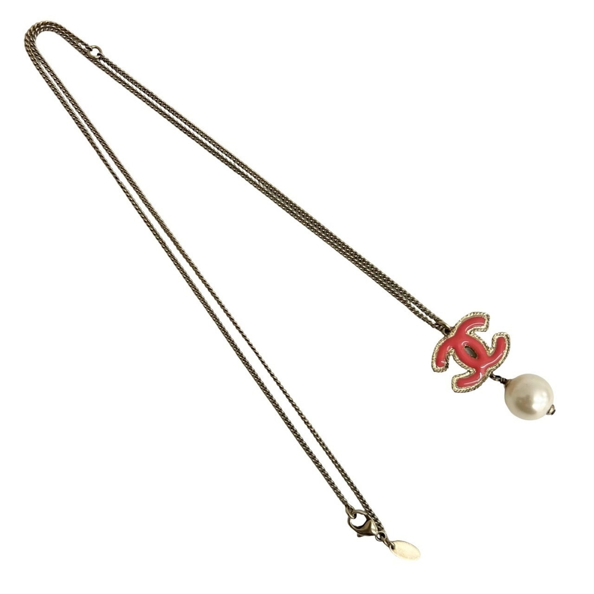 CHANEL Coco Mark Swing Pearl GP Faux Necklace Pendant in Gold and Pink 65975