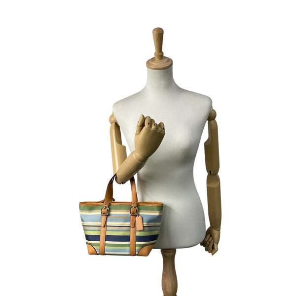 Coach mini tote handbag in multi-stripe and border canvas leather with a logo charm silver hardware navy, blue, green, multicolor. Women\'s T1