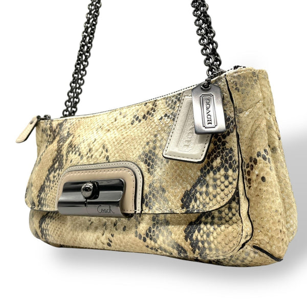 COACH Women\'s S30 One-Shoulder Beige Embossed Leather Handbag with Chain Strap and Logo Charm