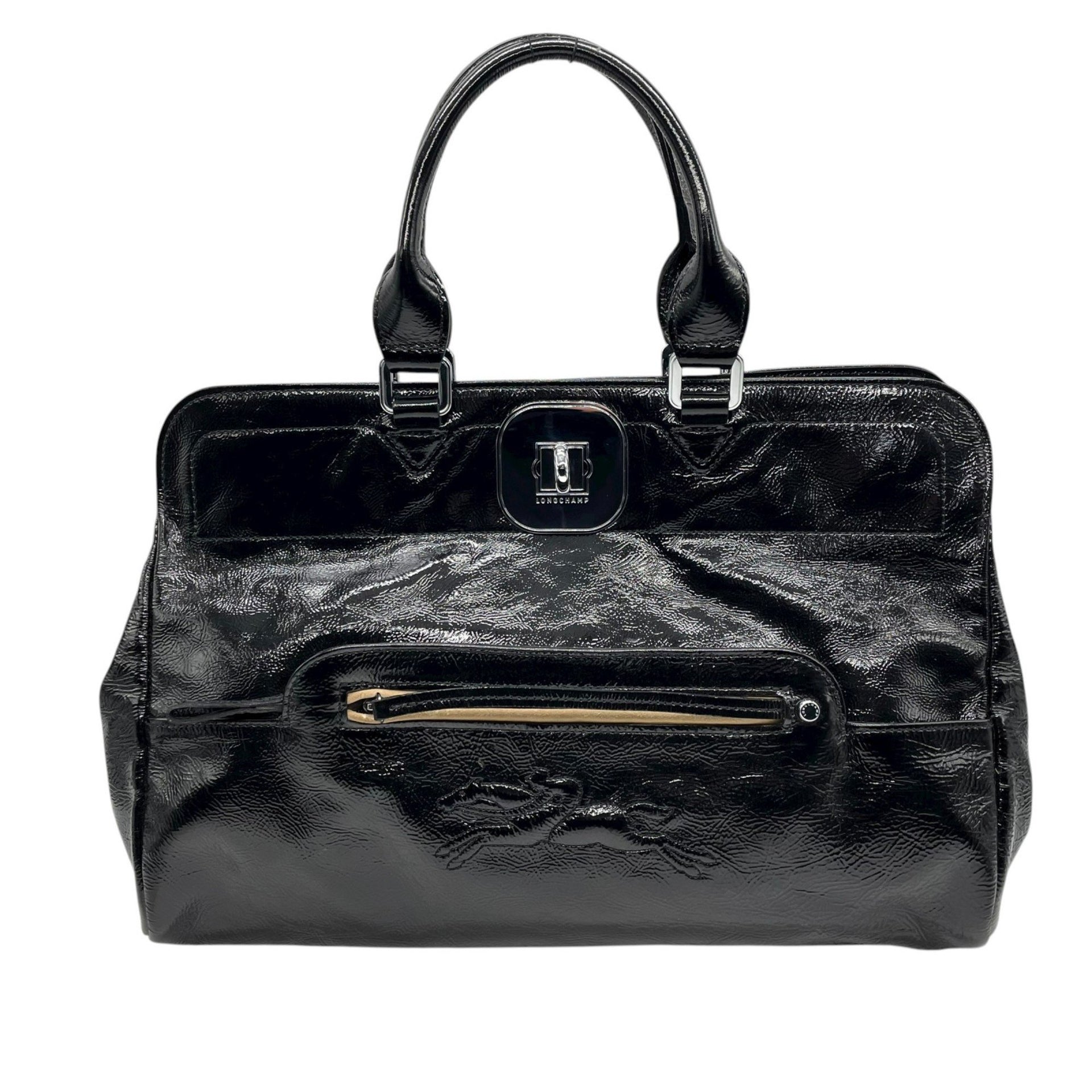 LONGCHAMP Patent Leather Handbag, Black with Silver Hardware, A5
