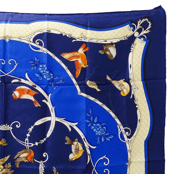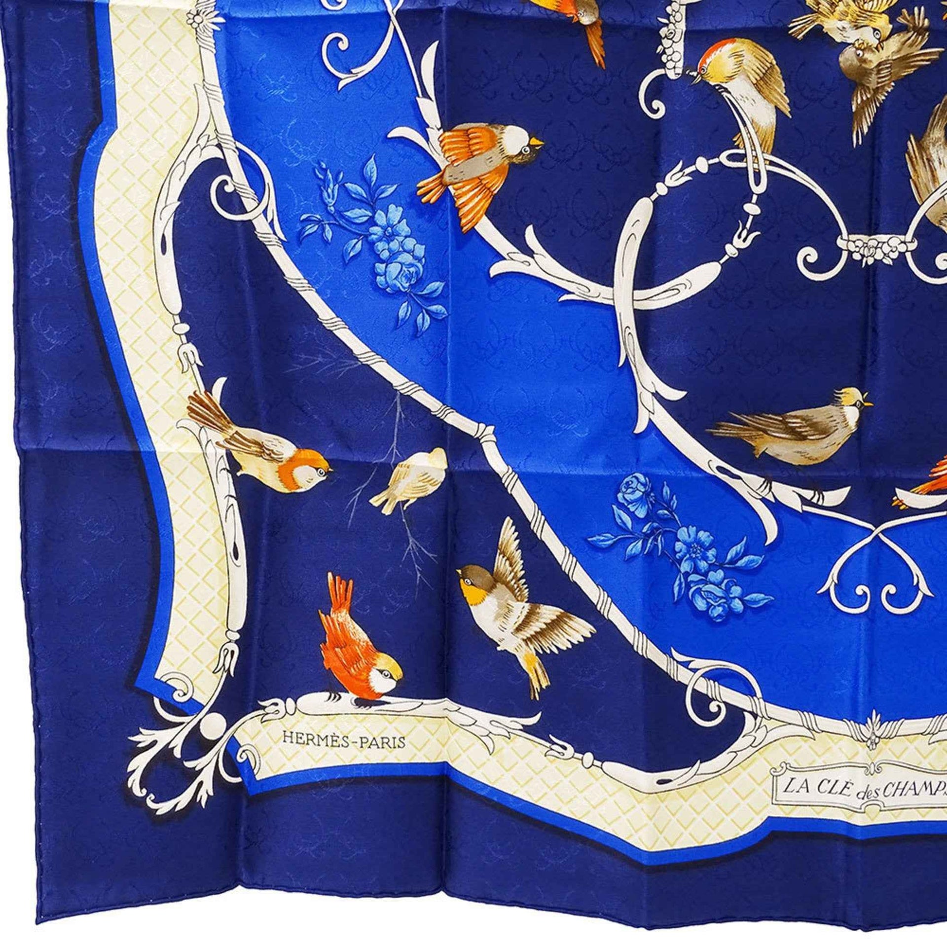 Hermes Hermès LA CLE des CHAMPS Carré 90 Scarf, Women\'s, Silk, Navy Blue, Large, Bird, Flower Design