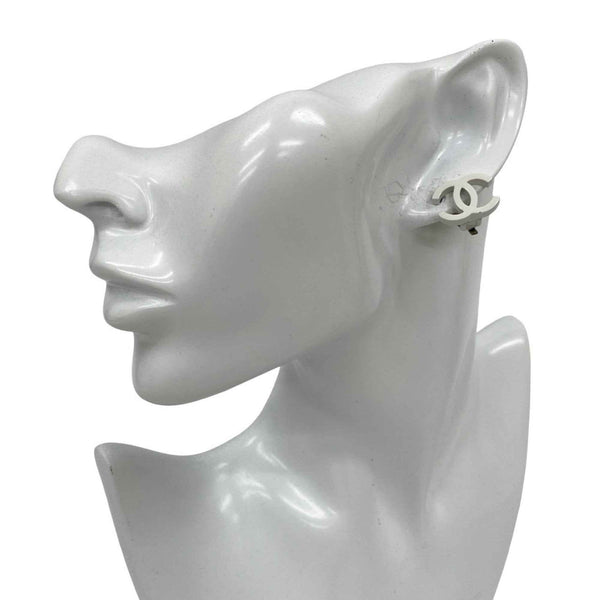 04C CHANEL Coco Mark Plastic Earrings/Ear Cuffs in White and Silver (05489)